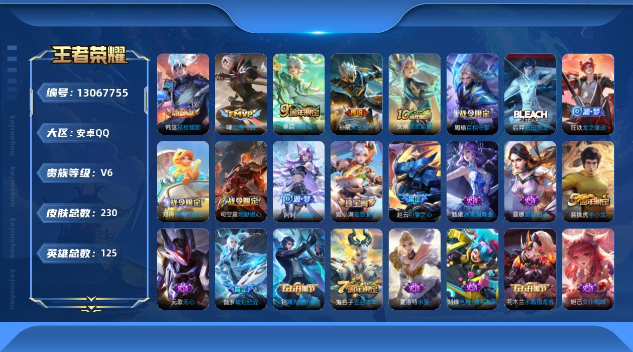 [13067755]【特价急出/详情看图】安卓Q-V6-至尊星耀IV段位-125英雄-230皮肤-1典藏-3传说-67史诗