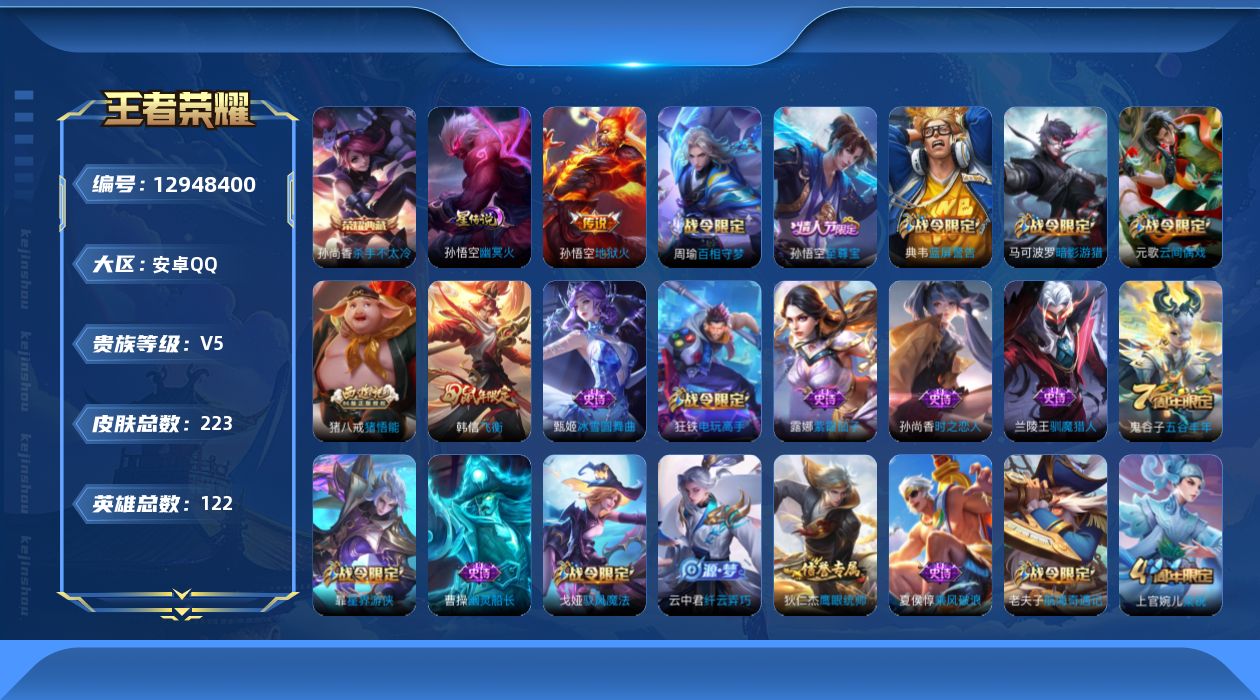 [12948400]安卓Q-V5-永恒钻石I段位-122英雄-223皮肤-1典藏-1传说-50史诗
