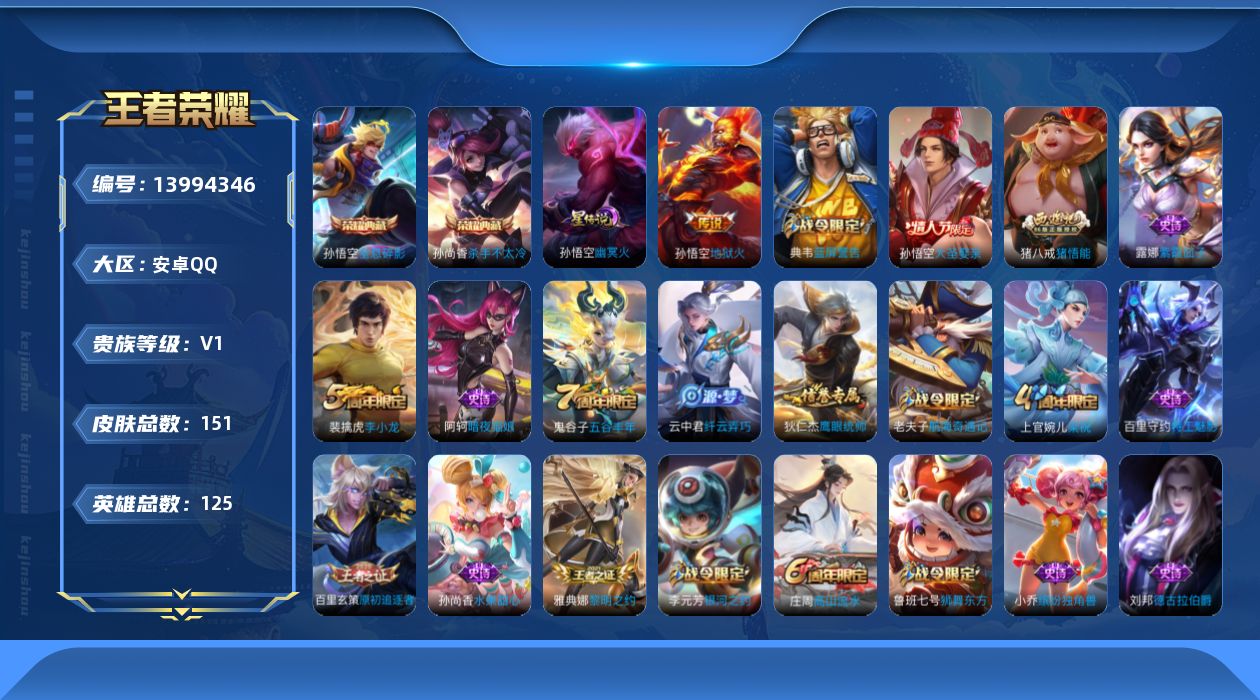 [13994346]安卓Q-V0-荣耀黄金II段位-119英雄-151皮肤-2典藏-1星传说-1传说-28史诗 【荣耀典藏】:孙悟空全息碎影,孙尚香杀手不太冷 【传说皮肤】:孙悟空地狱火 【限定皮肤】:白起狰,狄仁杰阴阳师,虞姬凯尔特女王,赵云皇家上将,墨子神迹守卫,鲁班七号狮舞东方,庄周高山流水,高渐离死亡摇滚,芈月重明,夏侯惇朔风刀,曹操烛龙,典韦穷奇,典韦蓝屏警告,狄仁杰魔术师,狄仁杰万华元夜,达摩沙漠行僧,项羽海滩派对,老夫子醍醐杖,老夫子航海奇遇记,程咬金演武夺筹,兰陵王金庭之子,孙悟空大圣娶亲,牛魔御旌,李元芳银河之约,李元芳云中旅人,钟馗神迹守卫,钟馗驱傩正仪,女娲朔望之晖,干将莫邪胡桃夹子,雅典娜黎明之约,太乙真人饕餮,鬼谷子原初探秘者,鬼谷子五谷丰年,苏烈千军破阵,百里玄策原初追逐者,弈星混沌棋,沈梦溪星空之诺,沈梦溪大漠名商,明世隐疑决卦,裴擒虎李小龙,狂铁御狮,米莱狄御霄,云中君纤云弄巧,盾山御銮,猪八戒猪悟能,上官婉儿梁祝,鲁班大师探海日志,鬼谷子天穹祈灯 【赛季限定】:白起狰,芈月重明,夏侯惇朔风刀,曹操烛龙,典韦穷奇,狄仁杰万华元夜,达摩沙漠行僧,老夫子醍醐杖,程咬金演武夺筹,兰陵王金庭之子,牛魔御旌,李元芳云中旅人,虞姬凯尔特女王,钟馗驱傩正仪,雅典娜黎明之约,太乙真人饕餮,鬼谷子原初探秘者,苏烈千军破阵,百里玄策原初追逐者,弈星混沌棋,沈梦溪大漠名商,明世隐疑决卦,狂铁御狮,米莱狄御霄,盾山御銮,鲁班大师探海日志,鬼谷子天穹祈灯 【战令限定】:墨子神迹守卫,鲁班七号狮舞东方,典韦蓝屏警告,老夫子航海奇遇记,李元芳银河之约,钟馗神迹守卫,女娲朔望之晖,沈梦溪星空之诺 【史诗皮肤】:露娜紫霞仙子,阿轲暗夜猫娘,赵云皇家上将,貂蝉圣诞恋歌,王昭君偶像歌手,狄仁杰魔术师,孙尚香水果甜心,墨子金属风暴,刘邦德古拉伯爵,小乔缤纷独角兽,雅典娜冰冠公主,百里守约特工魅影,李元芳逐浪之夏,程咬金功夫厨神,孙悟空大圣娶亲,典韦蓝屏警告,鲁班七号狮舞东方,狄仁杰鹰眼统帅,上官婉儿梁祝,李元芳银河之约,百里玄策原初追逐者,裴擒虎李小龙,云中君纤云弄巧,老夫子航海奇遇记,猪八戒猪悟能,庄周高山流水,雅典娜黎明之约,鬼谷子五谷丰年 【其他皮肤】:项羽海滩派对,韩信教廷特使,韩信街头霸王,阿轲爱心护理,达摩大发明家,扁鹊化身博士,宫本武藏未来纪元,安琪拉玩偶对对碰,孙膑天使之翼,
