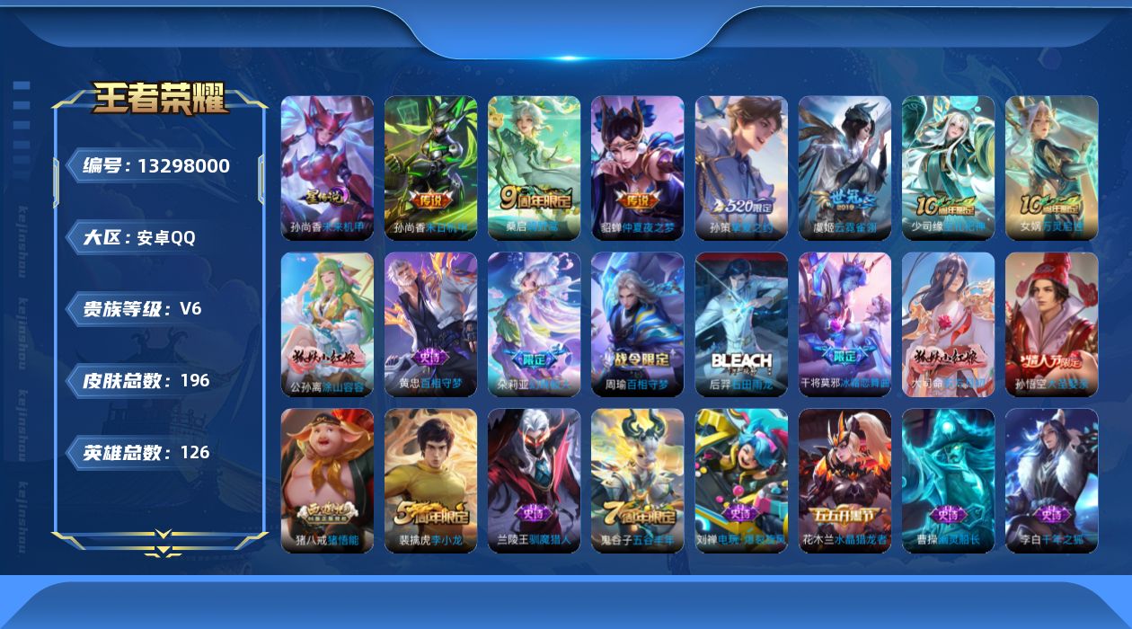 [13298000]【特价急出/详情看图】安卓Q-V6-最强王者段位-126英雄-196皮肤-6传说-48史诗