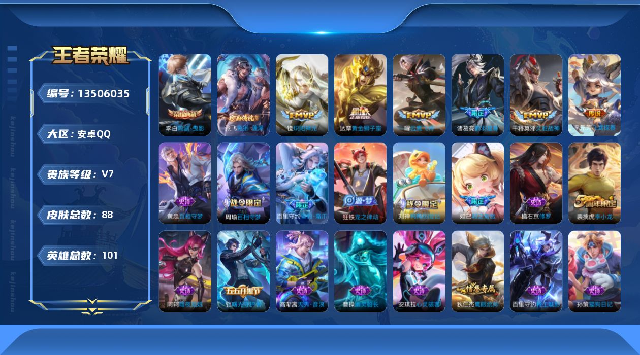 [13506035]【店主推荐捡漏号!可直接换绑】安卓Q-V7-至尊星耀IV段位-101英雄-88皮肤-1典藏 -1珍品传说-6传说-26史诗