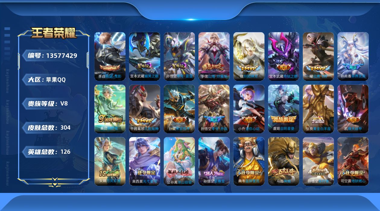 [13577429]苹果Q-V8-最强王者段位-126英雄-304皮肤-1典藏-2星传说-13传说-82史诗