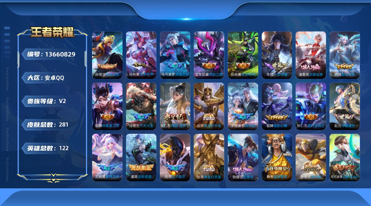 [13660829]可二次【店主推荐捡漏号!可直接换绑】安卓Q-V8-尊贵铂金I段位-120英雄-281皮肤-1典藏-18传说-74史诗 【荣耀典藏】:孙悟空全息碎影 【传说皮肤】:干将莫邪画中仙,孙悟空齐天大圣,狄仁杰神器狴犴令,王昭君星穹之声,马可波罗深海之息,后羿无尽星芒,赵云淬星耀世,西施游龙清影,虞姬启明星使,李信一念神魔,貂蝉猫影幻舞,张良黄金白羊座,后羿黄金射手座,诸葛亮武陵仙君,貂蝉仲夏夜之梦,孙尚香末日机甲,宫本武藏地狱之眼,狄仁杰超时空战士 【限定皮肤】:姜子牙天穹之誓,狄仁杰阴阳师,赵云皇家上将,赵云百木心枪,墨子神迹守卫,墨子降魔,孙尚香蔷薇恋人,鲁班七号狮舞东方,庄周高山流水,钟无艳超时空战士,白起夜都怪侠,芈月重明,芈月幻夜卜梦,周瑜赤莲之焰,元歌云间偶戏,元歌无心,夏侯惇朔风刀,夏侯惇匿光决锋者,甄姬落雪兰心,曹操烛龙,典韦穷奇,典韦蓝屏警告,马可波罗深海之息,马可波罗山海玄木吟,狄仁杰魔术师,狄仁杰万华元夜,狄仁杰神器狴犴令,达摩沙漠行僧,项羽海滩派对,老夫子航海奇遇记,程咬金演武夺筹,刘邦夺宝奇兵,王昭君午后时光,王昭君星穹之声,兰陵王驯魔猎人,兰陵王金庭之子,亚瑟潮玩骑士王,孙悟空至尊宝,孙悟空孙行者,孙悟空齐天大圣,牛魔御旌,后羿辉光之辰,后羿如梦令,后羿圣弓游侠,后羿无尽星芒,李元芳银河之约,李元芳云中旅人,虞姬启明星使,钟馗神迹守卫,钟馗驱傩正仪,杨玉环遇见飞天,杨戬潮玩骑兵,女娲朔望之晖,干将莫邪真爱魔法,干将莫邪画中仙,蔡文姬繁星吟游,太乙真人饕餮,鬼谷子原初探秘者,鬼谷子五谷丰年,诸葛亮武陵仙君,黄忠火炮绅士,苏烈千军破阵,弈星混沌棋,公孙离玉兔公主,沈梦溪星空之诺,沈梦溪大漠名商,明世隐吟游魔法,裴擒虎天狼狩猎者,裴擒虎李小龙,裴擒虎擒涛扼浪,狂铁御狮,狂铁电玩高手,米莱狄御霄,盾山御銮,猪八戒猪悟能,上官婉儿梁祝,上官婉儿神器万象笔,嫦娥如梦令,嫦娥暖冬兔眠,鲁班大师匿光启智者,桑启海盐诗旅,金蝉唐三藏,暃星界游侠,阿古朵江河有灵,张良古海寻踪,鬼谷子天穹祈灯 【年限皮肤】:后羿辉光之辰,马可波罗山海玄木吟 【赛季限定】:芈月重明,夏侯惇朔风刀,曹操烛龙,典韦穷奇,狄仁杰万华元夜,达摩沙漠行僧,程咬金演武夺筹,兰陵王金庭之子,张良古海寻踪,牛魔御旌,李元芳云中旅人,钟馗驱傩正仪,太乙真人饕餮,鬼谷子原初探秘者,苏烈千军破阵,弈星混沌