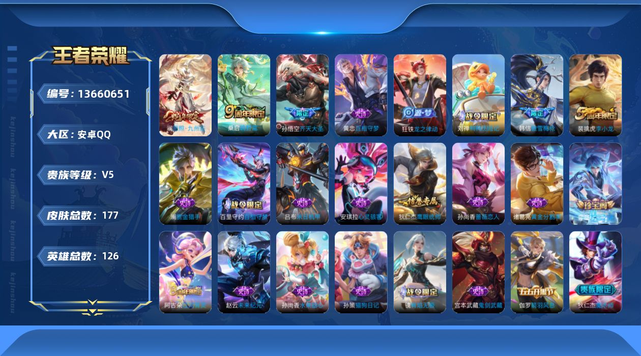 [13660651]【店主推荐捡漏号!可直接换绑】安卓Q-V5-永恒钻石V段位-126英雄-177皮肤-4传说-31史诗 【英雄全皮】:影全皮 【传说皮肤】:后羿神树通天,澜愿照九州拓,桑启鸣野蒿,孙悟空齐天大圣 【限定皮肤】:姜子牙天穹之誓,杨戬破阵退雄兵,狄仁杰阴阳师,赵云皇家上将,孙尚香蔷薇恋人,甄姬落雪兰心,狄仁杰魔术师,狄仁杰万华元夜,达摩沙漠行僧,项羽海滩派对,老夫子醍醐杖,韩信傲雪梅枪,兰陵王金庭之子,孙悟空齐天大圣,李元芳云中旅人,钟馗驱傩正仪,杨戬潮玩骑兵,苏烈千军破阵,沈梦溪大漠名商,裴擒虎李小龙,裴擒虎擒涛扼浪,鲁班大师探海日志,桑启海盐诗旅,阿古朵江河有灵,张良古海寻踪,蒙犽百解令,鬼谷子天穹祈灯,沈梦溪龙舞盛年,刘邦剑破天穹,镜青焰无极,项羽苍威无极,刘备异域游侠,周瑜熔金海岸 【赛季限定】:狄仁杰万华元夜,达摩沙漠行僧,老夫子醍醐杖,兰陵王金庭之子,张良古海寻踪,李元芳云中旅人,钟馗驱傩正仪,苏烈千军破阵,沈梦溪大漠名商,裴擒虎擒涛扼浪,鲁班大师探海日志,桑启海盐诗旅,鬼谷子天穹祈灯,刘邦剑破天穹,姜子牙天穹之誓 【战令限定】:甄姬落雪兰心,杨戬潮玩骑兵,镜青焰无极,项羽苍威无极 【史诗皮肤】:赵云皇家上将,赵云未来纪元,貂蝉圣诞恋歌,狄仁杰魔术师,廉颇地狱岩魂,宫本武藏鬼剑武藏,孙尚香蔷薇恋人,孙尚香水果甜心,嬴政摇滚巨星,妲己魅力维加斯,刘禅绅士熊喵,吕布末日机甲,诸葛亮黄金分割率,雅典娜冰冠公主,安琪拉心灵骇客,孙策猫狗日记,伽罗箭羽风息,狄仁杰鹰眼统帅,裴擒虎李小龙,钟馗乐园奇幻夜,韩信傲雪梅枪,澜赏金猎手,阿古朵江河有灵,蒙犽百解令,镜青焰无极,百里守约百相守梦,孙膑茶境仙,弈星万物之道,刘禅鸭鸭历险记,狂铁龙之律动,黄忠百相守梦 【其他皮肤】:项羽海滩派对,韩信教廷特使,韩信街头霸王,露娜哥特玫瑰,阿轲爱心护理,赵云白执事,赵云忍炎影,程咬金星际陆战队,扁鹊救世之瞳,宫本武藏未来纪元,安琪拉玩偶对对碰,妲己少女阿狸,典韦黄金武士,亚瑟死亡骑士,达摩拳王,花木兰兔女郎,甄姬花好人间,狄仁杰阴阳师,刘备纽约教父,刘备汉昭烈帝,关羽龙腾万里,钟无艳海滩丽影,宫本武藏霸王丸,狂铁命运角斗场,老夫子功夫老勺,孙尚香沉稳之力,诸葛亮掌控之力,李白敏锐之力,大乔守护之力,明世隐虹云星官,吕布野性能量,哪吒次元突破,老夫子醍醐杖,狂铁特工战影,狄仁杰万华元夜,