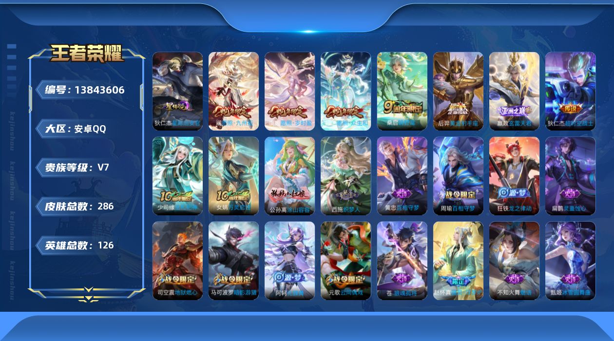 [13843606]【店主推荐捡漏号!可直接换绑】安卓Q-V7-最强王者段位-126英雄-286皮肤-8传说-77史诗 【英雄全皮】:苍全皮,鬼谷子全皮,影全皮 【传说皮肤】:后羿神树通天,妲己愿照众生和,澜愿照九州拓,虞姬愿照岁时盈,嬴政玄雷天君,桑启鸣野蒿,后羿黄金射手座,狄仁杰超时空战士 【限定皮肤】:白起狰,姜子牙天穹之誓,杨戬破阵退雄兵,狄仁杰阴阳师,虞姬凯尔特女王,赵云皇家上将,孙尚香蔷薇恋人,鲁班七号狮舞东方,庄周高山流水,高渐离玩趣恶龙,孙膑妖精王,芈月重明,元歌云间偶戏,元歌无心,夏侯惇朔风刀,典韦穷奇,马可波罗暗影游猎,狄仁杰魔术师,狄仁杰万华元夜,达摩星际陆战队,达摩沙漠行僧,项羽海滩派对,老夫子醍醐杖,貂蝉逐梦之音,程咬金演武夺筹,兰陵王金庭之子,亚瑟潮玩骑士王,牛魔御旌,李元芳云中旅人,钟馗神迹守卫,钟馗驱傩正仪,干将莫邪胡桃夹子,蔡文姬繁星吟游,鬼谷子原初探秘者,鬼谷子五谷丰年,苏烈千军破阵,弈星混沌棋,梦奇顽趣,沈梦溪星空之诺,沈梦溪大漠名商,明世隐疑决卦,裴擒虎擒涛扼浪,狂铁御狮,米莱狄御霄,米莱狄胡桃异想国,云中君纤云弄巧,盾山御銮,猪八戒西部大镖客,嫦娥拒霜思,鲁班大师探海日志,桑启海盐诗旅,艾琳流音漫舞,司空震地狱燃心,阿古朵江河有灵,张良古海寻踪,蒙犽百解令,鬼谷子天穹祈灯,沈梦溪龙舞盛年,刘邦剑破天穹,程咬金群星魔术团,芈月浮光幕影,周瑜熔金海岸 【赛季限定】:孙膑妖精王,白起狰,芈月重明,夏侯惇朔风刀,典韦穷奇,狄仁杰万华元夜,达摩沙漠行僧,老夫子醍醐杖,程咬金演武夺筹,兰陵王金庭之子,张良古海寻踪,牛魔御旌,李元芳云中旅人,虞姬凯尔特女王,钟馗驱傩正仪,鬼谷子原初探秘者,苏烈千军破阵,弈星混沌棋,梦奇顽趣,沈梦溪大漠名商,明世隐疑决卦,裴擒虎擒涛扼浪,狂铁御狮,米莱狄御霄,盾山御銮,鲁班大师探海日志,桑启海盐诗旅,鬼谷子天穹祈灯,刘邦剑破天穹,姜子牙天穹之誓 【战令限定】:鲁班七号狮舞东方,元歌云间偶戏,马可波罗暗影游猎,达摩星际陆战队,艾琳流音漫舞,亚瑟潮玩骑士王,钟馗神迹守卫,沈梦溪星空之诺,米莱狄胡桃异想国,猪八戒西部大镖客,司空震地狱燃心 【史诗皮肤】:露娜紫霞仙子,赵云皇家上将,赵云未来纪元,貂蝉圣诞恋歌,甄姬冰雪圆舞曲,王昭君偶像歌手,狄仁杰魔术师,廉颇地狱岩魂,宫本武藏鬼剑武藏,孙尚香蔷薇恋人,孙尚香水果甜心,嬴政摇滚巨星,