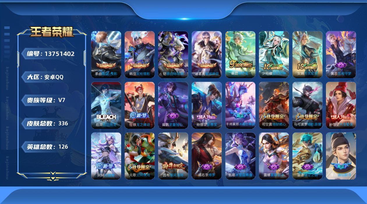 - [11933641]V7 11传说 123英雄 303皮肤 可修改实名 优质装备:猫影幻舞,末日机甲-孙尚香(绿蚂蚱),超时空战士-狄仁杰,碎云,电玩·雷克斯,灼幽烈阳 传说皮:幻光神枪 珍宝阁皮:妄想食味,玩趣恶龙 限定皮:愿照·九州拓(澜年限),愿照·众生和(妲己年限),鸣野蒿,至尊宝,五谷丰年,游园惊梦,李小龙,孙行者,寅虎·瑞焰(虎皮蛋子) 史诗皮:鸭鸭历险记-刘禅,苍鳞隐世,龙之律动,雪豹·霜爪,百相守梦-周瑜,茶境仙,蔬乡物语(鲁班七号),百相守梦-百里守约,紫霞仙子,特工魅影,江河有灵,匿光侦查者,百解令(蒙犽),高渐离燃音魔法,青蛇,电玩·爆裂旋风,暗夜猫娘,末日机甲-吕布,猫狗日记-孙策,猫狗日记-大乔,乱世虎臣,节奏热浪,女仆咖啡,摇滚巨星,水果甜心,绅士熊喵,天才门将,星夜王子,心灵骇客,功夫厨神,德古拉伯爵,幽灵船长,鬼剑武藏,心灵战警,拒霜思,缤纷独角兽,乘风破浪,逐浪之夏,水晶猎龙者,曙光守护者,箭羽风息,金属风暴,圣诞恋歌,鹰眼统帅,赏金猎手,无心,未来纪元-赵云
