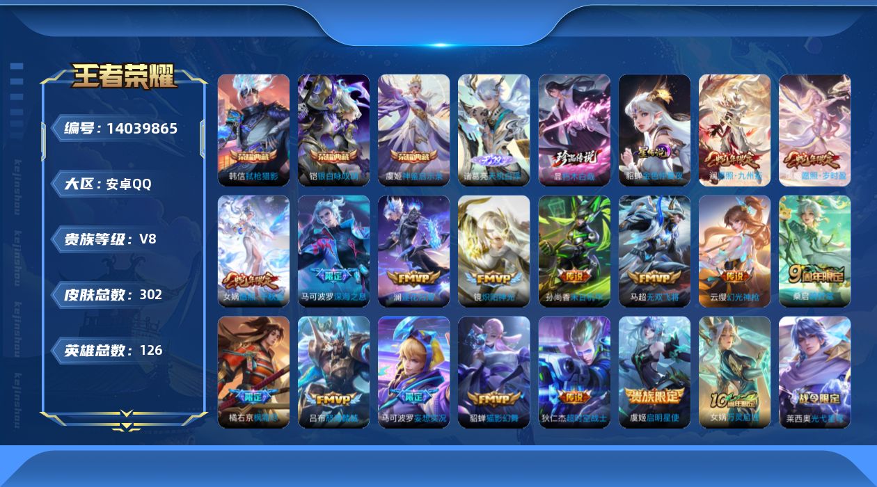 [14039865]【店主推荐捡漏号!可直接换绑】安卓Q-V8-最强王者段位-126英雄-302皮肤-3典藏-1无双-1珍品传说-17传说-84史诗