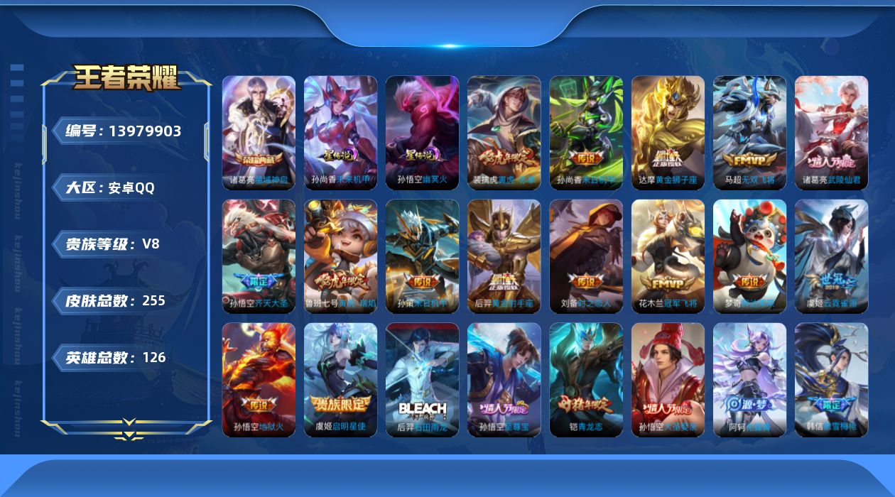 [13979903]【店主推荐捡漏号!可直接换绑】安卓Q-V8-至尊星耀II段位-126英雄-255皮肤-1典藏-3星元-15传说-61史诗 【荣耀典藏】:诸葛亮星域神启 【传说皮肤】:孙悟空齐天大圣,马超无双飞将,孙策末日机甲,裴擒虎寅虎赤拳,鲁班七号寅虎瑞焰,虞姬启明星使,刘备时之恋人,虞姬云霓雀翎,达摩黄金狮子座,花木兰冠军飞将,梦奇胖达荣荣,后羿黄金射手座,诸葛亮武陵仙君,孙尚香末日机甲,孙悟空地狱火 【限定皮肤】:狄仁杰阴阳师,赵云皇家上将,孙尚香蔷薇恋人,鲁班七号狮舞东方,鲁班七号寅虎瑞焰,高渐离玩趣恶龙,钟无艳超时空战士,扁鹊奇幻香踪,白起夜都怪侠,芈月幻夜卜梦,吕布猎兽之王,元歌云间偶戏,元歌无心,夏侯惇朔风刀,甄姬落雪兰心,狄仁杰魔术师,狄仁杰万华元夜,达摩沙漠行僧,项羽海滩派对,老夫子醍醐杖,程咬金演武夺筹,韩信飞衡,韩信傲雪梅枪,王昭君午后时光,兰陵王金庭之子,孙悟空至尊宝,孙悟空大圣娶亲,孙悟空齐天大圣,后羿如梦令,李元芳云中旅人,虞姬启明星使,钟馗神迹守卫,钟馗驱傩正仪,杨戬潮玩骑兵,太乙真人饕餮,鬼谷子原初探秘者,鬼谷子五谷丰年,诸葛亮武陵仙君,黄忠火炮绅士,铠青龙志,苏烈千军破阵,百里守约朱雀志,弈星混沌棋,沈梦溪大漠名商,沈梦溪匿光破解者,明世隐疑决卦,明世隐吟游魔法,裴擒虎李小龙,裴擒虎寅虎赤拳,裴擒虎擒涛扼浪,狂铁御狮,狂铁电玩高手,米莱狄御霄,云中君时之祈愿,盾山御銮,嫦娥暖冬兔眠,西施玲珑珍味,鲁班大师匿光启智者,鲁班大师探海日志,桑启海盐诗旅,金蝉唐三藏,暃星界游侠,张良古海寻踪,鬼谷子天穹祈灯 【年限皮肤】:百里守约朱雀志,铠青龙志,裴擒虎寅虎赤拳,鲁班七号寅虎瑞焰,韩信飞衡 【赛季限定】:夏侯惇朔风刀,狄仁杰万华元夜,达摩沙漠行僧,老夫子醍醐杖,程咬金演武夺筹,兰陵王金庭之子,张良古海寻踪,李元芳云中旅人,钟馗驱傩正仪,太乙真人饕餮,鬼谷子原初探秘者,苏烈千军破阵,弈星混沌棋,沈梦溪大漠名商,明世隐疑决卦,裴擒虎擒涛扼浪,狂铁御狮,米莱狄御霄,盾山御銮,鲁班大师探海日志,桑启海盐诗旅,鬼谷子天穹祈灯 【战令限定】:鲁班七号狮舞东方,钟无艳超时空战士,扁鹊奇幻香踪,白起夜都怪侠,芈月幻夜卜梦,吕布猎兽之王,元歌云间偶戏,甄姬落雪兰心,王昭君午后时光,钟馗神迹守卫,杨戬潮玩骑兵,黄忠火炮绅士,明世隐吟游魔法,狂铁电玩高手,嫦娥暖冬兔眠,西施玲