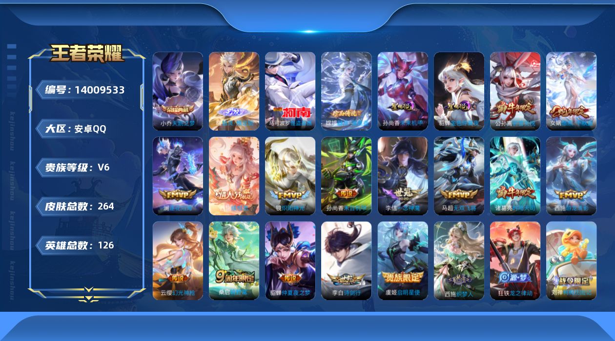 [14009533]可二次【店主推荐捡漏号!可直接换绑】安卓Q-V8-至尊星耀II段位-126英雄-264皮肤-1典藏-1无双-2珍品传说-16传说-73史诗 【英雄全皮】:影全皮 【荣耀典藏】:小乔天鹅之梦 【无双皮肤】:曜器灵螭龙剑 【珍品传说】:马可波罗怪盗基德,嫦娥器灵落星盏 【传说皮肤】:后羿神树通天,西施续相思,女娲愿照千秋盛,云缨幻光神枪,桑启鸣野蒿,澜逐花归海,李白诗剑行,马超无双飞将,西施游龙清影,公孙离祈雪灵祝,诸葛亮时雨天司,镜炽阳神光,虞姬启明星使,李信一念神魔,貂蝉仲夏夜之梦,孙尚香末日机甲 【限定皮肤】:姜子牙天穹之誓,狄仁杰阴阳师,赵云皇家上将,孙尚香蔷薇恋人,庄周高山流水,钟无艳超时空战士,扁鹊奇幻香踪,芈月白晶晶,芈月幻夜卜梦,元歌云间偶戏,元歌无心,甄姬落雪兰心,马可波罗山海玄木吟,狄仁杰魔术师,狄仁杰万华元夜,达摩沙漠行僧,项羽海滩派对,老夫子醍醐杖,程咬金演武夺筹,王昭君凤凰于飞,兰陵王金庭之子,亚瑟潮玩骑士王,孙悟空孙行者,后羿圣弓游侠,李元芳云中旅人,虞姬启明星使,钟馗驱傩正仪,杨玉环寅虎心曲,杨戬潮玩骑兵,干将莫邪真爱魔法,雅典娜黎明之约,鬼谷子五谷丰年,诸葛亮时雨天司,黄忠火炮绅士,苏烈千军破阵,百里玄策原初追逐者,百里守约朱雀志,梦奇顽趣,公孙离祈雪灵祝,沈梦溪大漠名商,裴擒虎李小龙,裴擒虎擒涛扼浪,云中君纤云弄巧,上官婉儿梁祝,嫦娥拒霜思,嫦娥暖冬兔眠,鲁班大师探海日志,桑启海盐诗旅,暃星界游侠,艾琳女武神,艾琳流音漫舞,司空震地狱燃心,阿古朵江河有灵,张良古海寻踪,蒙犽百解令,蒙恬荣光圣徽,高渐离燃音魔法,妲己灵卜魔法,鬼谷子天穹祈灯,刘邦剑破天穹,程咬金群星魔术团,周瑜熔金海岸 【年限皮肤】:百里守约朱雀志,杨玉环寅虎心曲,王昭君凤凰于飞,公孙离祈雪灵祝,诸葛亮时雨天司,马超神威,马可波罗山海玄木吟 【赛季限定】:狄仁杰万华元夜,达摩沙漠行僧,老夫子醍醐杖,程咬金演武夺筹,兰陵王金庭之子,张良古海寻踪,李元芳云中旅人,钟馗驱傩正仪,雅典娜黎明之约,苏烈千军破阵,百里玄策原初追逐者,梦奇顽趣,沈梦溪大漠名商,裴擒虎擒涛扼浪,鲁班大师探海日志,桑启海盐诗旅,鬼谷子天穹祈灯,蒙恬荣光圣徽,刘邦剑破天穹,姜子牙天穹之誓 【战令限定】:钟无艳超时空战士,扁鹊奇幻香踪,芈月幻夜卜梦,元歌云间偶戏,甄姬落雪兰心,艾琳流音漫舞,亚瑟潮玩骑士王,