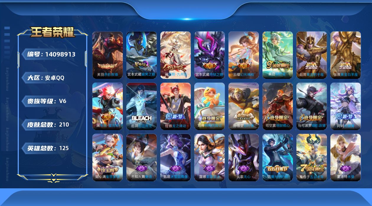 [14098913]可二次【店主推荐捡漏号!可直接换绑】,安卓Q-V6-最强王者段位-125英雄-210皮肤-1典藏-7传说-58史诗 【英雄全皮】:戈娅全皮 【荣耀典藏】:关羽赤影疾锋 【传说皮肤】:澜愿照九州拓,云缨幻光神枪,桑启鸣野蒿,澜电玩雷克斯,张良黄金白羊座,后羿黄金射手座,宫本武藏地狱之眼 【限定皮肤】:蒙犽顽岩魄,蔡文姬夏日便利店,虞姬夏日便利店,姜子牙天穹之誓,杨戬破阵退雄兵,狄仁杰阴阳师,赵云皇家上将,扁鹊奇幻香踪,元歌无心,马可波罗暗影游猎,狄仁杰魔术师,达摩沙漠行僧,项羽海滩派对,兰陵王金庭之子,孙悟空孙行者,李元芳云中旅人,钟馗驱傩正仪,杨戬潮玩骑兵,干将莫邪胡桃夹子,鬼谷子五谷丰年,苏烈千军破阵,沈梦溪大漠名商,沈梦溪匿光破解者,裴擒虎擒涛扼浪,云中君纤云弄巧,嫦娥暖冬兔眠,西施玲珑珍味,蒙犽狂想玩偶喵,鲁班大师探海日志,桑启海盐诗旅,暃星界游侠,戈娅驭风魔法,艾琳流音漫舞,司空震地狱燃心,阿古朵江河有灵,张良古海寻踪,蒙犽百解令,高渐离燃音魔法,妲己灵卜魔法,鬼谷子天穹祈灯,姬小满妄想食味,鲁班七号蔬乡物语,刘邦剑破天穹,程咬金群星魔术团,镜青焰无极,项羽苍威无极,周瑜熔金海岸 【赛季限定】:达摩沙漠行僧,兰陵王金庭之子,张良古海寻踪,李元芳云中旅人,钟馗驱傩正仪,苏烈千军破阵,沈梦溪大漠名商,裴擒虎擒涛扼浪,鲁班大师探海日志,桑启海盐诗旅,鬼谷子天穹祈灯,刘邦剑破天穹,姜子牙天穹之誓 【战令限定】:蔡文姬夏日便利店,虞姬夏日便利店,扁鹊奇幻香踪,马可波罗暗影游猎,艾琳流音漫舞,杨戬潮玩骑兵,嫦娥暖冬兔眠,西施玲珑珍味,蒙犽狂想玩偶喵,司空震地狱燃心,暃星界游侠,戈娅驭风魔法,高渐离燃音魔法,妲己灵卜魔法,鲁班七号蔬乡物语,镜青焰无极,项羽苍威无极 【史诗皮肤】:露娜紫霞仙子,赵云皇家上将,赵云未来纪元,貂蝉圣诞恋歌,甄姬冰雪圆舞曲,王昭君偶像歌手,狄仁杰魔术师,宫本武藏鬼剑武藏,孙尚香水果甜心,嬴政暗夜贵公子,妲己魅力维加斯,妲己女仆咖啡,墨子龙骑士,墨子金属风暴,吕布圣诞狂欢,刘禅绅士熊喵,曹操幽灵船长,吕布末日机甲,张飞乱世虎臣,花木兰水晶猎龙者,夏侯惇乘风破浪,小乔缤纷独角兽,兰陵王暗隐猎兽者,亚瑟心灵战警,安琪拉心灵骇客,百里守约特工魅影,铠曙光守护者,李元芳逐浪之夏,阿轲节奏热浪,狄仁杰鹰眼统帅,不知火舞魅语,马可波罗暗影游猎,蒙犽狂想玩偶喵