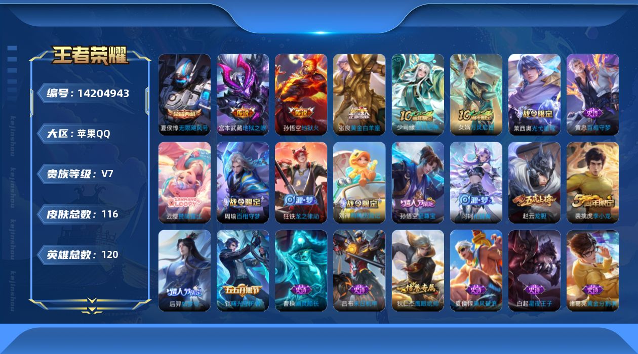 [14204943]【店主推荐捡漏号!可直接换绑】苹果Q-V7-永恒钻石I段位-120英雄-116皮肤-1典藏皮肤-4传说-36史诗 【英雄全皮】:孙权全皮 【荣耀典藏】:夏侯惇无限飓风号 【传说皮肤】:后羿神树通天,张良黄金白羊座,宫本武藏地狱之眼,孙悟空地狱火 【限定皮肤】:姜子牙天穹之誓,狄仁杰阴阳师,赵云皇家上将,赵云龙胆,阿轲迷踪丽影,狄仁杰魔术师,狄仁杰万华元夜,项羽海滩派对,老夫子醍醐杖,刘邦夺宝奇兵,孙悟空至尊宝,后羿如梦令,鬼谷子原初探秘者,弈星混沌棋,明世隐疑决卦,裴擒虎李小龙,周瑜熔金海岸 【年限皮肤】:赵云龙胆 【赛季限定】:狄仁杰万华元夜,老夫子醍醐杖,鬼谷子原初探秘者,弈星混沌棋,明世隐疑决卦,姜子牙天穹之誓 【战令限定】:阿轲迷踪丽影,刘邦夺宝奇兵 【史诗皮肤】:赵云皇家上将,狄仁杰魔术师,宫本武藏鬼剑武藏,孙尚香水果甜心,嬴政暗夜贵公子,妲己魅力维加斯,墨子龙骑士,吕布圣诞狂欢,曹操幽灵船长,吕布末日机甲,孙悟空至尊宝,夏侯惇乘风破浪,兰陵王暗隐猎兽者,诸葛亮黄金分割率,亚瑟心灵战警,铠曙光守护者,程咬金功夫厨神,白起星夜王子,阿轲节奏热浪,孙策猫狗日记,狄仁杰鹰眼统帅,后羿如梦令,大乔白蛇,阿轲迷踪丽影,赵云龙胆,裴擒虎李小龙,孙膑茶境仙,阿轲化蝶舞,刘禅鸭鸭历险记,狂铁龙之律动,周瑜百相守梦,云缨赞萌露比,黄忠百相守梦,莱西奥光弋星穹,女娲万灵启世,少司缘巫礼祀神 【其他皮肤】:项羽海滩派对,韩信街头霸王,露娜哥特玫瑰,赵云白执事,赵云忍炎影,白起白色死神,牛魔西部大镖客,孙膑天使之翼,妲己少女阿狸,典韦黄金武士,亚瑟死亡骑士,达摩拳王,甄姬花好人间,刘备万事如意,后羿阿尔法小队,狄仁杰阴阳师,刘备纽约教父,刘备汉昭烈帝,狂铁命运角斗场,诸葛亮掌控之力,吕布野性能量,弈星混沌棋,明世隐疑决卦,刘邦夺宝奇兵,盾山圆桌骑士,老夫子醍醐杖,鬼谷子原初探秘者,狄仁杰万华元夜,鲁班大师乓乓大师,后羿完美运算,姜子牙天穹之誓,周瑜熔金海岸,太乙真人谧流熔炉,马超访茗客,戈娅玫蓝誓约,刘备浪漫序章,钟馗虚灵犬护,沈梦溪鸭鸭历险记,露娜命运加冕,雅典娜潮玩士官长,姬小满小满鸭,白起死霸装,甄姬逆浪荇歌,孙策百相守梦,庄周锦麟游梦,莱西奥踏浪烽翎,哪吒罗小黑战记,亚瑟荣光之誓,明世隐往忆晖光,孙权径山谋武,艾琳鹤鸣心笺,老夫子潮流仙人,狄仁杰锦衣卫,周瑜海军大将,刘