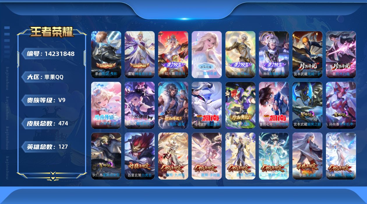 [14231848]有二次【店主推荐捡漏号!可直接换绑】发育路42段、打野38段,苹果Q-V9-最强王者段位-127英雄-474皮肤-2典藏皮肤-4无双-8珍品传说-4星传说-42传说-152史诗 【英雄全皮】:刘禅全皮,李白全皮,孙权全皮,钟馗全皮,鬼谷子全皮,李信全皮,猪八戒全皮,蒙恬全皮,司空震全皮,暃全皮,戈娅全皮,空空儿全皮,影全皮,海诺全皮,少司缘全皮 【荣耀典藏】:李白鸣剑曳影,虞姬神鉴启示录 【无双皮肤】:李白碎月剑心,韩信群星魔术团,不知火舞花合斗,甄姬雪境奇遇 【珍品传说】:马可波罗怪盗基德,鲁班七号江户川柯南,孙策时之奇旅,张飞兔狲蓬尾,瑶大耳狗之梦,安琪拉酷洛米之心,暃朽木白哉,宫本武藏黑崎一护 【传说皮肤】:后羿神树通天,司空震愿照山河定,女娲愿照千秋盛,妲己愿照众生和,澜愿照九州拓,蔡文姬愿照福禄聚,虞姬愿照岁时盈,云缨幻光神枪,嬴政玄雷天君,王昭君映山客,桑启鸣野蒿,铠冥王哈迪斯,孙尚香乘龙问璇玑,赵云乘龙铭钟鼎,澜逐花归海,马可波罗妄想实况,夏洛特浮生妄,孙悟空齐天大圣,小乔山海琳琅生,曜山海苍雷引,李信山海炽霜斩,李白诗剑行,马超无双飞将,蔡文姬花朝如约,孙策末日机甲,裴擒虎寅虎赤拳,鲁班七号寅虎瑞焰,孙尚香异界灵契,西施游龙清影,李元芳飞鸢探春,诸葛亮时雨天司,镜炽阳神光,虞姬启明星使,曜云鹰飞将,李信一念神魔,达摩黄金狮子座,百里玄策白虎志,后羿黄金射手座,李白凤求凰,孙尚香末日机甲,宫本武藏地狱之眼,狄仁杰超时空战士 【限定皮肤】:铠冥王哈迪斯,暃埋骨钱,蒙犽顽岩魄,蔡文姬夏日便利店,大乔绒语心约,虞姬夏日便利店,姜子牙天穹之誓,杨戬破阵退雄兵,李白谪仙醉月,狄仁杰阴阳师,廉颇寅虎御盾,小乔山海琳琅生,赵云皇家上将,赵云引擎之心,墨子神迹守卫,妲己时之彼端,孙尚香蔷薇恋人,孙尚香异界灵契,鲁班七号狮舞东方,鲁班七号寅虎瑞焰,庄周高山流水,高渐离死亡摇滚,高渐离玩趣恶龙,钟无艳超时空战士,孙膑天狼运算者,孙膑寅虎展翼,白起夜都怪侠,芈月白晶晶,芈月幻夜卜梦,吕布御风骁将,周瑜真爱至上,周瑜赤莲之焰,元歌云间偶戏,夏侯惇朔风刀,甄姬游园惊梦,甄姬落雪兰心,典韦蓝屏警告,典韦岱宗,马可波罗暗影游猎,马可波罗山海玄木吟,马可波罗妄想实况,狄仁杰魔术师,狄仁杰万华元夜,达摩沙漠行僧,项羽海滩派对,老夫子醍醐杖,老夫子航海奇遇记,关羽冰锋战神,程咬金演武夺