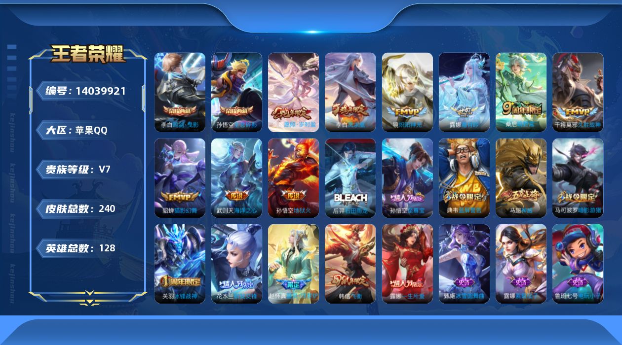 [14039921]【店主推荐捡漏号!可直接换绑】苹果Q-V7-永恒钻石II段位-128英雄-240皮肤-2典藏-10传说-63史诗 【英雄全皮】:蒙恬全皮,影全皮 【荣耀典藏】:武则天英雄,孙悟空全息碎影,李白鸣剑曳影 【传说皮肤】:后羿神树通天,虞姬愿照岁时盈,桑启鸣野蒿,露娜霜月吟,镜炽阳神光,貂蝉猫影幻舞,干将莫邪久胜战神,李白凤求凰,孙悟空地狱火,武则天海洋之心 【限定皮肤】:白起狰,狄仁杰阴阳师,赵云皇家上将,孙尚香蔷薇恋人,鲁班七号狮舞东方,庄周高山流水,高渐离死亡摇滚,芈月重明,周瑜赤莲之焰,夏侯惇朔风刀,甄姬幽恒,甄姬游园惊梦,曹操烛龙,典韦穷奇,典韦蓝屏警告,马可波罗暗影游猎,狄仁杰魔术师,狄仁杰万华元夜,达摩沙漠行僧,项羽海滩派对,老夫子醍醐杖,关羽冰锋战神,程咬金演武夺筹,露娜一生所爱,韩信飞衡,兰陵王驯魔猎人,兰陵王金庭之子,花木兰默契交锋,孙悟空美猴王,孙悟空至尊宝,牛魔御旌,李元芳银河之约,李元芳云中旅人,钟馗神迹守卫,钟馗驱傩正仪,杨玉环遇见飞天,女娲朔望之晖,雅典娜黎明之约,蔡文姬繁星吟游,太乙真人饕餮,鬼谷子原初探秘者,鬼谷子五谷丰年,苏烈千军破阵,百里玄策原初追逐者,弈星混沌棋,沈梦溪星空之诺,沈梦溪大漠名商,明世隐疑决卦,裴擒虎李小龙,裴擒虎擒涛扼浪,狂铁御狮,米莱狄御霄,盾山御銮,猪八戒西部大镖客,上官婉儿梁祝,鲁班大师探海日志,桑启海盐诗旅,阿古朵江河有灵,张良古海寻踪,蒙恬荣光圣徽,鬼谷子天穹祈灯 【年限皮肤】:孙悟空美猴王,李白凤求凰,甄姬幽恒,韩信飞衡,马超神威 【赛季限定】:白起狰,芈月重明,夏侯惇朔风刀,曹操烛龙,典韦穷奇,狄仁杰万华元夜,达摩沙漠行僧,老夫子醍醐杖,程咬金演武夺筹,兰陵王金庭之子,张良古海寻踪,牛魔御旌,李元芳云中旅人,钟馗驱傩正仪,雅典娜黎明之约,太乙真人饕餮,鬼谷子原初探秘者,苏烈千军破阵,百里玄策原初追逐者,弈星混沌棋,沈梦溪大漠名商,明世隐疑决卦,裴擒虎擒涛扼浪,狂铁御狮,米莱狄御霄,盾山御銮,鲁班大师探海日志,桑启海盐诗旅,鬼谷子天穹祈灯,蒙恬荣光圣徽 【战令限定】:鲁班七号狮舞东方,周瑜赤莲之焰,典韦蓝屏警告,马可波罗暗影游猎,兰陵王驯魔猎人,李元芳银河之约,钟馗神迹守卫,女娲朔望之晖,沈梦溪星空之诺,猪八戒西部大镖客 【史诗皮肤】:鲁班七号电玩小子,露娜紫霞仙子,赵云皇家上将,赵云未来纪元,貂蝉圣诞