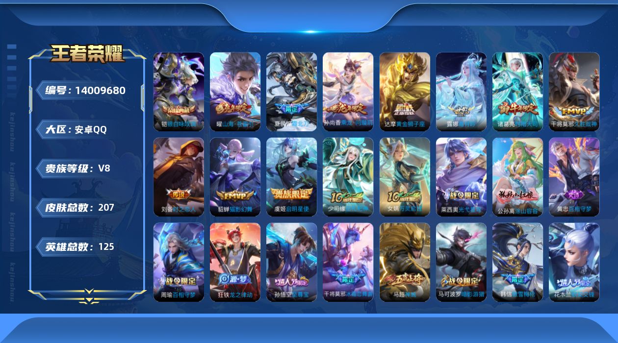 [14009680]【店主推荐捡漏号!可直接换绑】安卓Q-V8-最强王者段位-125英雄-207皮肤-1典藏-13传说-65史诗 【荣耀典藏】:铠银白咏叹调 【传说皮肤】:杨戬纵目迁山,后羿神树通天,干将莫邪千山共赴,夏侯惇霜北刀,孙尚香乘龙问璇玑,露娜霜月吟,曜山海苍雷引,诸葛亮时雨天司,虞姬启明星使,刘备时之恋人,貂蝉猫影幻舞,干将莫邪久胜战神,达摩黄金狮子座 【限定皮肤】:夏侯惇霜北刀,姜子牙天穹之誓,狄仁杰阴阳师,赵云皇家上将,庄周高山流水,高渐离死亡摇滚,高渐离玩趣恶龙,芈月白晶晶,元歌云间偶戏,元歌无心,马可波罗暗影游猎,狄仁杰魔术师,狄仁杰万华元夜,达摩沙漠行僧,项羽海滩派对,老夫子醍醐杖,程咬金演武夺筹,韩信傲雪梅枪,兰陵王金庭之子,花木兰默契交锋,亚瑟潮玩骑士王,孙悟空至尊宝,后羿圣弓游侠,李元芳云中旅人,虞姬霸王别姬,虞姬启明星使,钟馗驱傩正仪,干将莫邪冰霜恋舞曲,干将莫邪胡桃夹子,干将莫邪真爱魔法,雅典娜单词大作战,雅典娜黎明之约,蔡文姬繁星吟游,太乙真人饕餮,太乙真人华丽摇滚,鬼谷子原初探秘者,鬼谷子五谷丰年,诸葛亮时雨天司,苏烈千军破阵,百里玄策原初追逐者,弈星混沌棋,梦奇顽趣,沈梦溪大漠名商,明世隐疑决卦,裴擒虎李小龙,裴擒虎擒涛扼浪,米莱狄御霄,云中君纤云弄巧,猪八戒西部大镖客,上官婉儿梁祝,嫦娥拒霜思,曜山海苍雷引,蒙犽狂想玩偶喵,鲁班大师探海日志,桑启海盐诗旅,艾琳女武神,张良古海寻踪,蒙恬荣光圣徽,鬼谷子天穹祈灯,孙尚香乘龙问璇玑,沈梦溪龙舞盛年,程咬金群星魔术团,周瑜熔金海岸 【年限皮肤】:诸葛亮时雨天司,马超神威,曜山海苍雷引,孙尚香乘龙问璇玑 【赛季限定】:狄仁杰万华元夜,达摩沙漠行僧,老夫子醍醐杖,程咬金演武夺筹,兰陵王金庭之子,张良古海寻踪,李元芳云中旅人,钟馗驱傩正仪,雅典娜黎明之约,太乙真人饕餮,鬼谷子原初探秘者,苏烈千军破阵,百里玄策原初追逐者,弈星混沌棋,梦奇顽趣,沈梦溪大漠名商,明世隐疑决卦,裴擒虎擒涛扼浪,米莱狄御霄,鲁班大师探海日志,桑启海盐诗旅,鬼谷子天穹祈灯,蒙恬荣光圣徽,姜子牙天穹之誓 【战令限定】:元歌云间偶戏,马可波罗暗影游猎,亚瑟潮玩骑士王,后羿圣弓游侠,干将莫邪真爱魔法,雅典娜单词大作战,猪八戒西部大镖客,蒙犽狂想玩偶喵 【史诗皮肤】:鲁班七号电玩小子,露娜紫霞仙子,赵云皇家上将,貂蝉圣诞恋歌,甄姬冰雪圆舞曲,