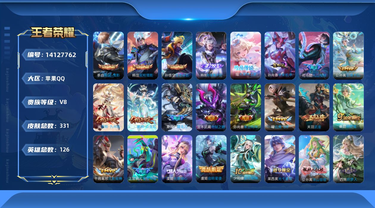 [14127762]可二次,【店主推荐捡漏号!可直接换绑】苹果Q-V8-最强王者段位-126英雄-331皮肤-3典藏-1无双-1珍品传说-14传说-84史诗