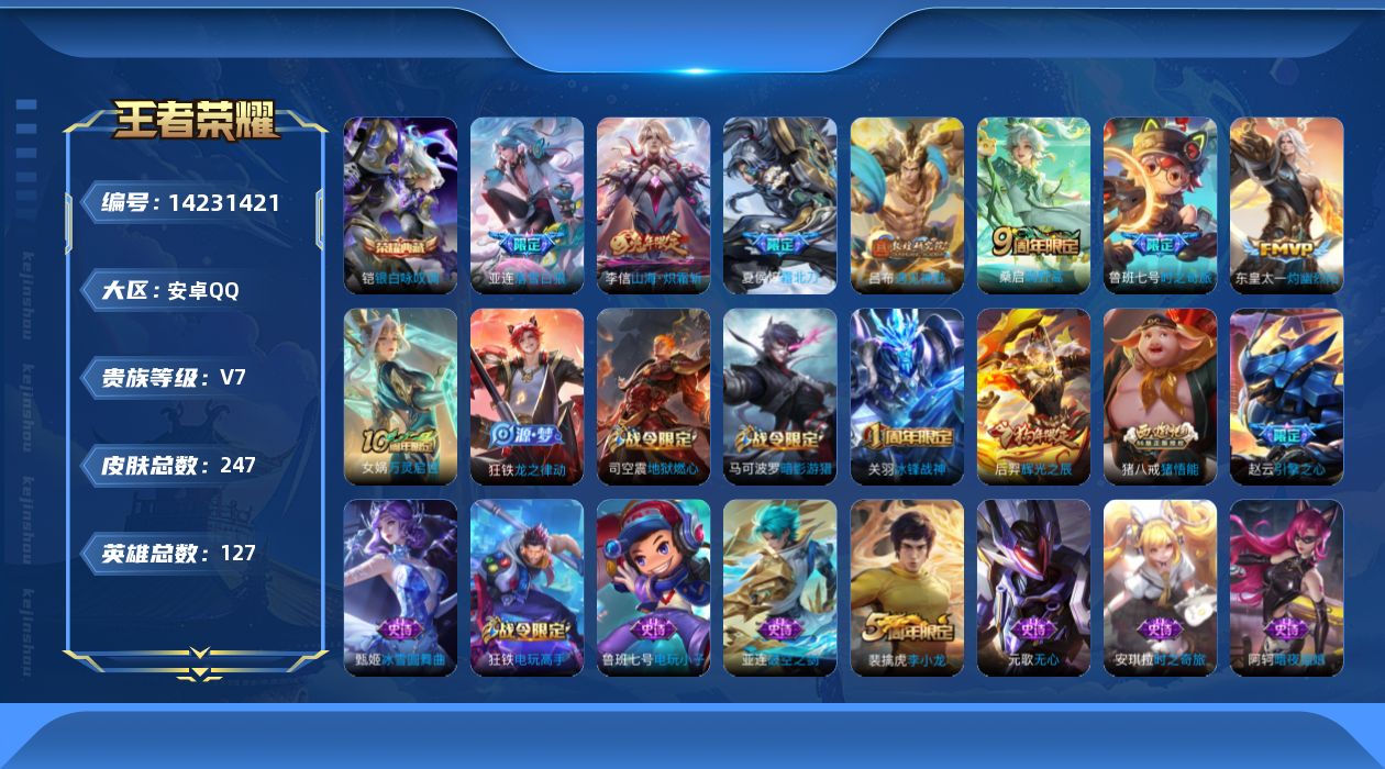 [14231421]【店主推荐捡漏号!可直接换绑】安卓Q-V7-至尊星耀I段位-127英雄-247皮肤-1典藏皮肤-8传说-73史诗