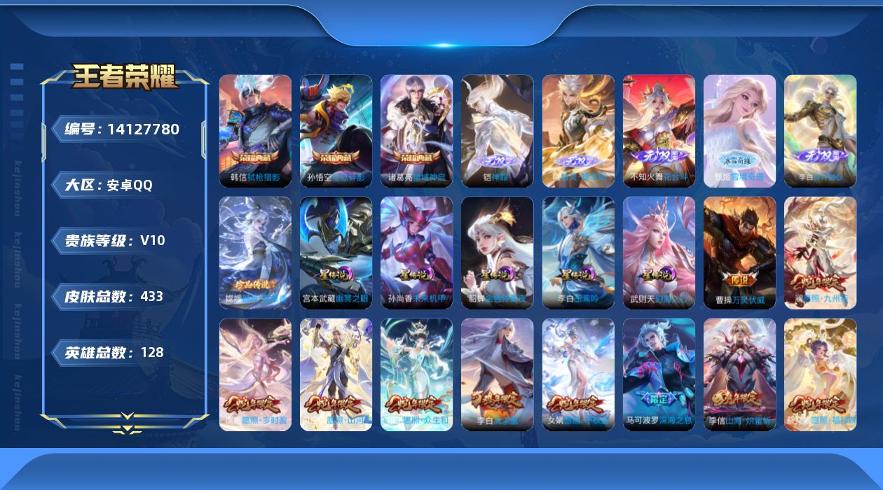[14127780]可二次【店主推荐捡漏号!可直接换绑】安卓Q-V10-最强王者段位-128英雄-433皮肤-3典藏-5星传说-5无双-1珍品传说-42传说-126史诗 【英雄全皮】:刘邦全皮,孙权全皮,苍全皮,狂铁全皮,蒙恬全皮,莱西奥全皮,影全皮,海诺全皮 【荣耀典藏】:武则天英雄,孙悟空全息碎影,诸葛亮星域神启,韩信弑枪猎影 【无双皮肤】:李白碎月剑心,不知火舞花合斗,甄姬雪境奇遇,曜器灵螭龙剑,铠神罪 【珍品传说】:嫦娥器灵落星盏 【传说皮肤】:杨戬纵目迁山,后羿神树通天,曹操万灵伏威,司空震愿照山河定,女娲愿照千秋盛,妲己愿照众生和,澜愿照九州拓,蔡文姬愿照福禄聚,虞姬愿照岁时盈,云缨幻光神枪,桑启鸣野蒿,庄周牧神诗旅,夏侯惇霜北刀,云中君群星魔术团,孙尚香乘龙问璇玑,孙策乘龙淬吴钩,赵云乘龙铭钟鼎,澜逐花归海,艾琳觅芳踪,甄姬至美化雀舞,吕布遇见神鼓,马可波罗妄想实况,李信山海炽霜斩,吕布怒海麟威,马可波罗深海之息,周瑜音你心动,小乔音你心动,李元芳飞鸢探春,虞姬启明星使,曜云鹰飞将,伽罗太华,张良黄金白羊座,干将莫邪久胜战神,达摩黄金狮子座,后羿黄金射手座,诸葛亮武陵仙君,貂蝉仲夏夜之梦,李白凤求凰,孙尚香末日机甲,宫本武藏地狱之眼,孙悟空地狱火,武则天海洋之心 【限定皮肤】:白起狰,夏侯惇霜北刀,蔡文姬夏日便利店,大乔绒语心约,虞姬夏日便利店,姜子牙天穹之誓,李白谪仙醉月,狄仁杰阴阳师,虞姬凯尔特女王,赵云皇家上将,赵云引擎之心,妲己时之彼端,嬴政白昼王子,鲁班七号狮舞东方,庄周高山流水,高渐离玩趣恶龙,阿轲迷踪丽影,孙膑妖精王,扁鹊炼金王,芈月重明,吕布猎兽之王,吕布御风骁将,吕布遇见神鼓,周瑜赤莲之焰,元歌云间偶戏,元歌无心,夏侯惇朔风刀,甄姬女儿国国王,甄姬游园惊梦,甄姬至美化雀舞,曹操烛龙,典韦穷奇,典韦蓝屏警告,典韦岱宗,马可波罗暗影游猎,马可波罗深海之息,马可波罗山海玄木吟,马可波罗妄想实况,狄仁杰魔术师,狄仁杰万华元夜,达摩沙漠行僧,项羽海滩派对,老夫子醍醐杖,关羽冰锋战神,程咬金演武夺筹,刘邦夺宝奇兵,韩信傲雪梅枪,王昭君凤凰于飞,王昭君午后时光,兰陵王驯魔猎人,兰陵王金庭之子,花木兰默契交锋,亚瑟潮玩骑士王,孙悟空至尊宝,孙悟空孙行者,牛魔御旌,后羿辉光之辰,后羿圣弓游侠,李元芳云中旅人,虞姬霸王别姬,虞姬启明星使,钟馗神迹守卫,钟馗驱傩正仪,杨玉环