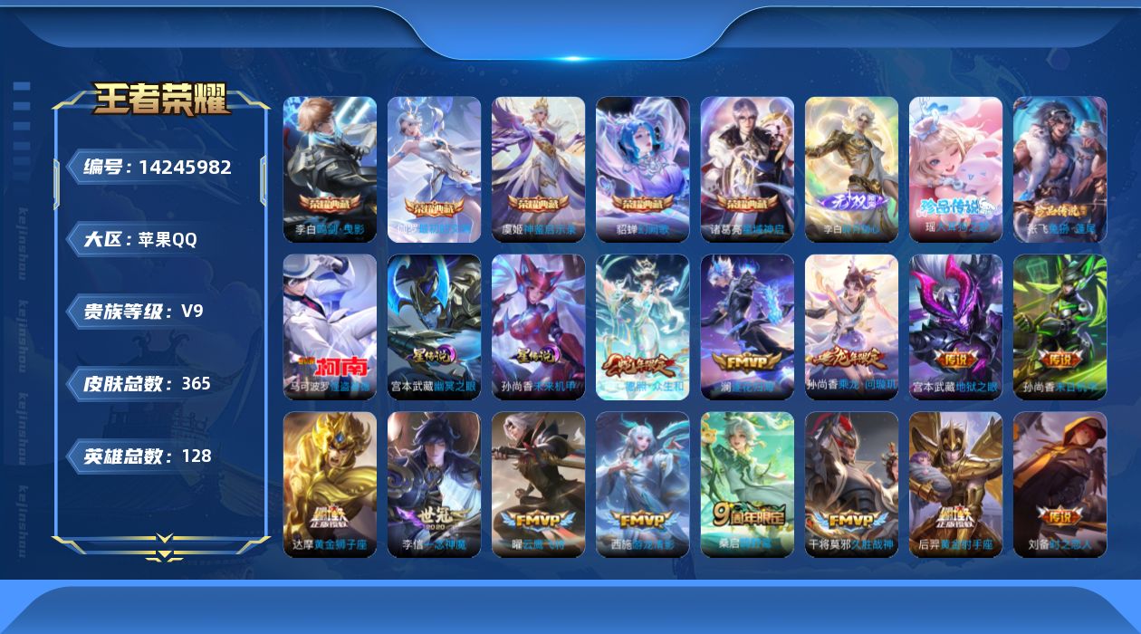 [14245982]可二次【店主推荐捡漏号!可直接换绑】苹果Q-V9-至尊星耀V段位-128英雄-365皮肤-5典藏皮肤-1典藏英雄-1无双-3珍品传说-21传说-99史诗
