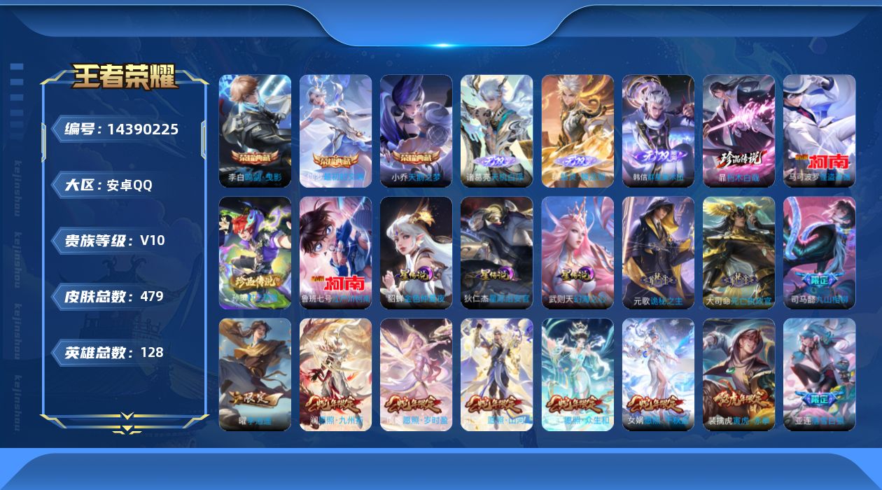 [14390225]【店主推荐捡漏号!可直接换绑】:安卓Q-V10-最强王者段位-128英雄-479皮肤-3典藏皮肤-1典藏英雄-3无双-4珍品传说-4星元-59传说-154史诗