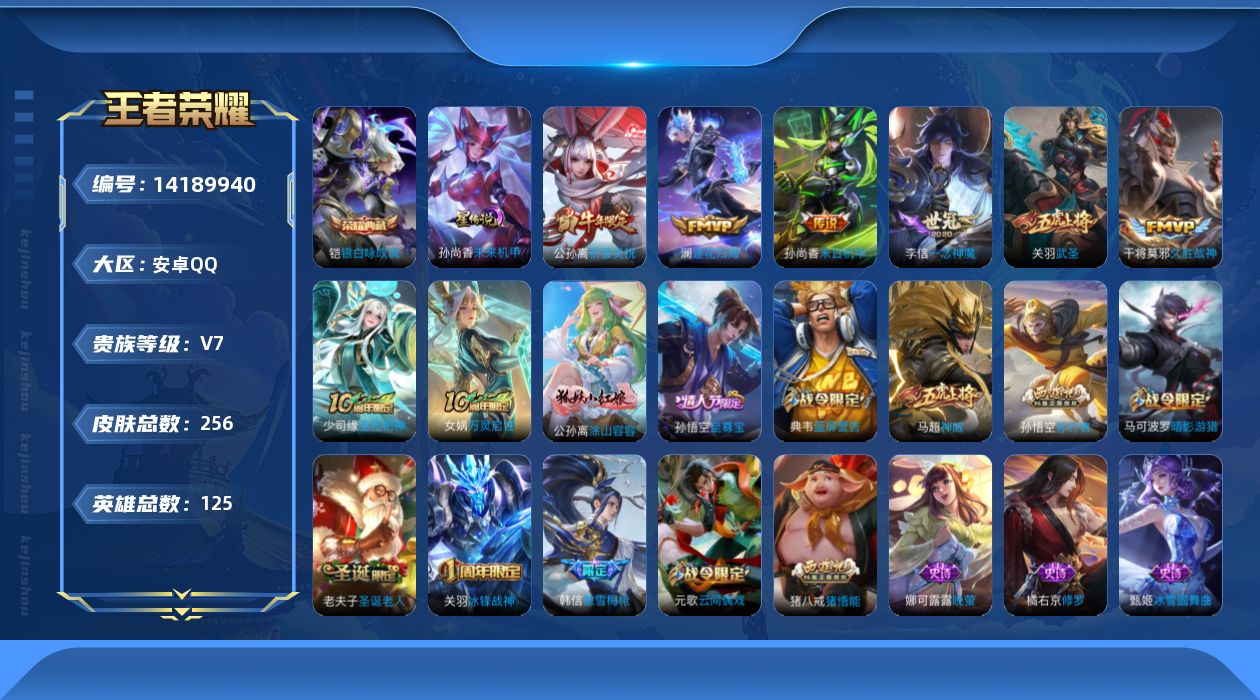 [14189940]安卓Q-V7-最强王者段位-125英雄-256皮肤-1典藏皮肤-7传说-72史诗