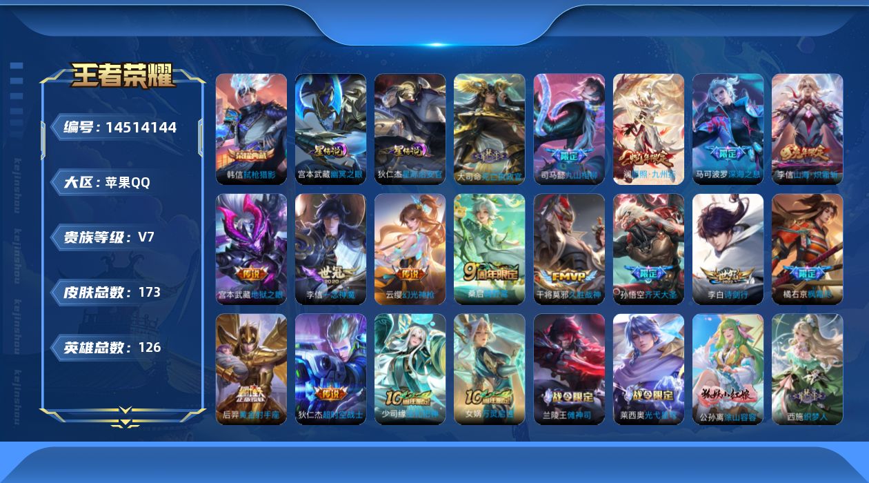 [14514144]【店主推荐捡漏号!可直接换绑】苹果Q-V7-最强王者段位-126英雄-173皮肤-1典藏皮肤-16传说-53史诗