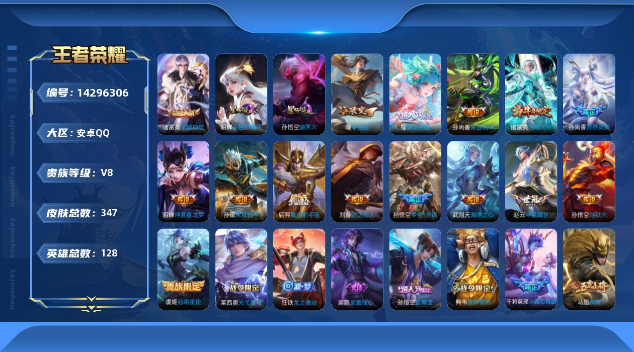 [14296306]可二次【店主推荐捡漏号!可直接换绑】安卓Q-V8-最强王者段位-128英雄-347皮肤-1典藏皮肤-1典藏英雄-15传说-112史诗