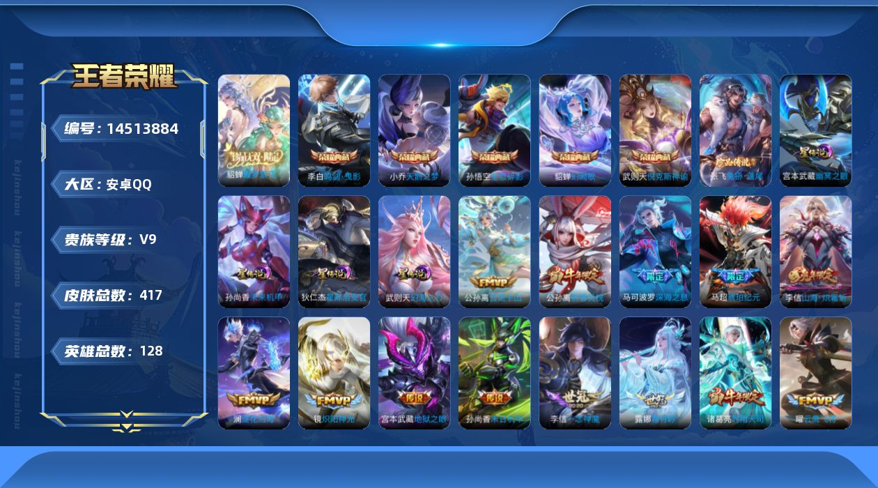 [14513884]【店主推荐捡漏号!可直接换绑】安卓Q-V9-最强王者段位-128英雄-417皮肤-5典藏皮肤-1典藏英雄-1珍品无双-1珍品传说-33传说-123史诗
