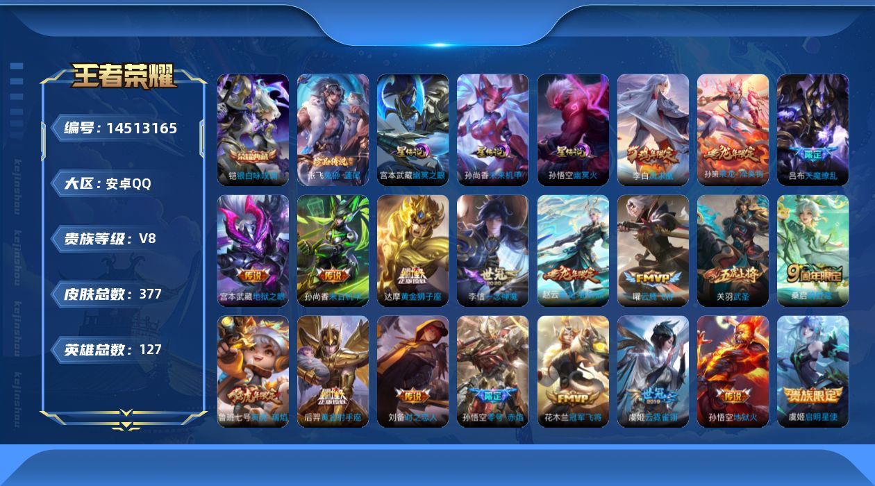 [14513165]【店主推荐捡漏号!可直接换绑】安卓Q-V8-最强王者段位-127英雄-377皮肤-1典藏皮肤-1珍品传说-20传说-122史诗