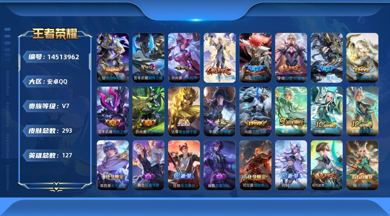 [14513962]【店主推荐捡漏号!可直接换绑】万战凯、万战司空震、万战宫本武藏,对抗路54段、打野48段,安卓Q-V7-最强王者段位-127英雄-293皮肤-1典藏皮肤-2星传说-12传说-76史诗