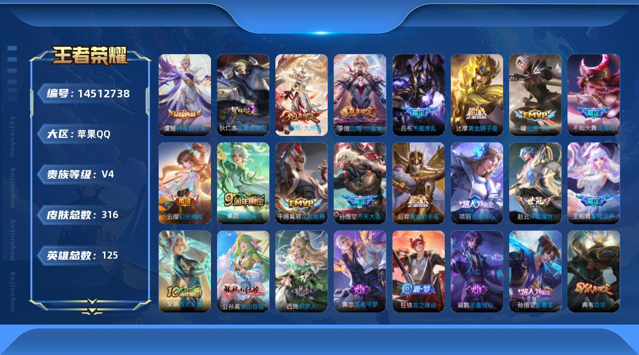 - [11471623]V7 1典藏 8传说 125英雄 271皮肤 可修改实名 优质装备:弑枪猎影(韩信典藏),冠军飞将,一念神魔,地狱之眼,碎云,山海·苍雷引(电光曜子),涂山容容 传说皮:九山相柳 珍宝阁皮:万物之道,优雅恋人,玩趣恶龙 限定皮:愿照·九州拓(澜年限),鸣野蒿,傲雪梅枪,高山流水,降魔,五谷丰年,青龙志(铠年限),梁祝,天狼溯光者,逐梦之影,如梦令-后羿,圣诞老人,猪悟能,匿光追影者,山海·玄木吟(马可年限) 史诗皮:鸭鸭历险记-刘禅,化蝶舞,灵蛊蚀心,星界战将,龙之律动,石田雨龙,蒙犽顽岩魄,琥珀纪元伽罗,百相守梦-黄忠,紫霞仙子,电玩小子(小书包),黄金分割率,特工魅影,千年之狐,江河有灵,雪夜绮愿(周瑜),百解令(蒙犽),高渐离燃音魔法,蒙恬荣光圣徽,无限星赏官,偶像歌手,电玩·爆裂旋风,银翎春语,龙骑士(小龙虾),末日机甲-吕布,猫狗日记-孙策,节奏热浪,修罗,女仆咖啡,摇滚巨星,水果甜心,星夜王子,心灵骇客,功夫厨神,德古拉伯爵,暗隐猎兽者,幽灵船长,鬼剑武藏,暗渊魔法,心灵战警,乐园奇幻夜,天秀·启明,舞动绿茵,地狱岩魂,纤云弄巧,拒霜思,乘风破浪,逐浪之夏,月团寄思,水晶猎龙者,曙光守护者,金属风暴,原初追逐者,圣诞狂欢,圣诞恋歌,鹰眼统帅,王者之锤,魅力维加斯,无心,未来纪元-赵云