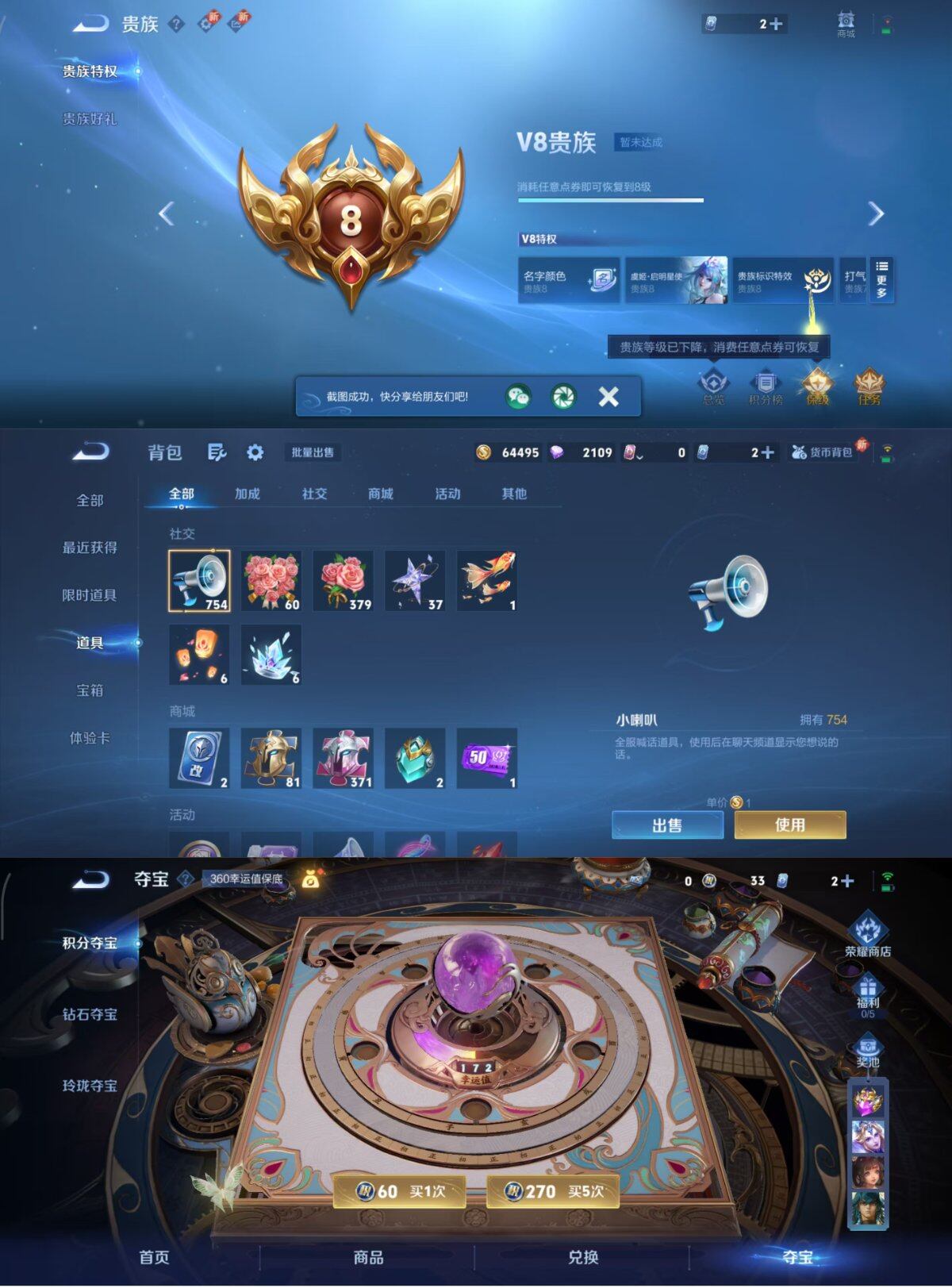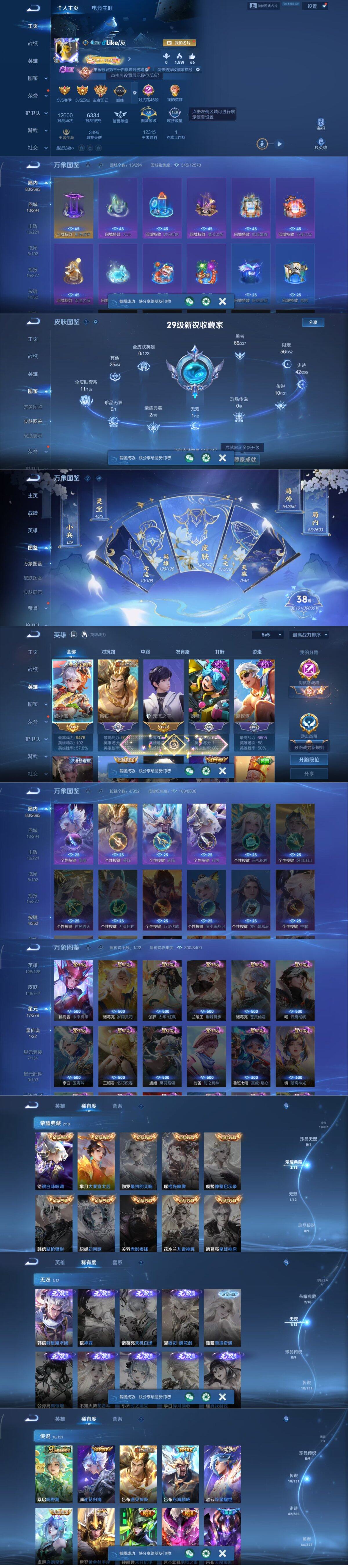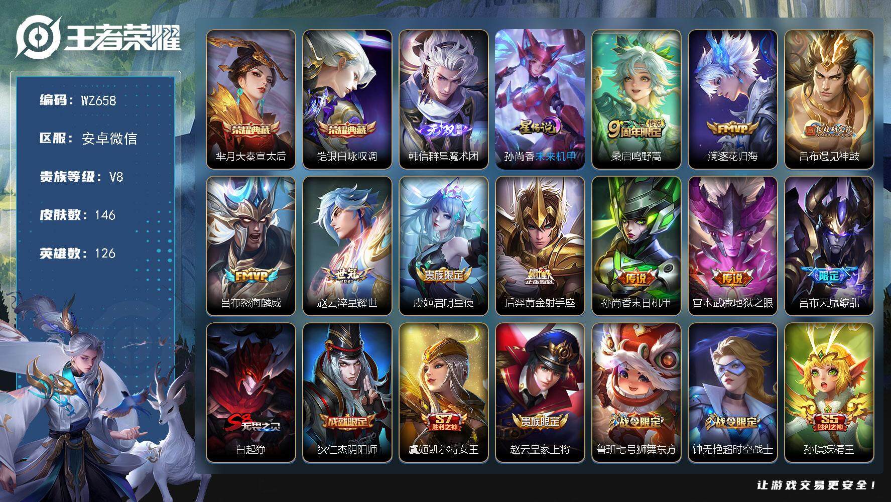 - [12254714]V8 2典藏 24传说 126英雄 384皮肤 典藏英雄武则天 可修改实名 优质装备:天鹅之梦(小乔典藏),倪克斯神谕(宇宙婆娘),冠军飞将,猫影幻舞,一念神魔,末日机甲-孙尚香(绿蚂蚱),零号·赤焰,末日机甲-孙策,花朝如约(花篮子),挚爱之约,挚爱花嫁,神器·狴犴令 珍宝阁皮:女武神,玩趣恶龙 限定皮:至尊宝,凤求凰(白切鸡),太华(伽罗年限),异界灵契(白毛香),傲雪梅枪,补天,寅虎·展翼(孙膑年限),前尘镜,时之彼端,时雨天司(水龙头),飞衡(韩信年限),玄嵩(庄周年限),瑞麟志(木兰年限),遇见飞天,高山流水,五谷丰年,青龙志(铠年限),冰锋战神,幽恒(沐浴露),游园惊梦,梁祝,逐梦之翼,天狼溯光者,逐梦之音,天狼征服者,祈雪灵祝(雪兔子),李小龙,逐梦之影,逐梦之光,玄武志(苏烈年限),朱雀志(守约年限),辉光之辰,孙行者,猪悟能,一生所爱,大圣娶亲,冰霜恋舞曲,美猴王,匿光追影者,女儿国国王,寅虎·御盾(廉颇年限),寅虎·瑞焰(虎皮蛋子),寅虎·心曲(虎婆),寅虎·赤拳(老虎年限),时之祈愿-云中君,时之祈愿-瑶(瑶传限),百木心枪,无尽星芒,深海之息(深海大菠萝),唐三藏,枫霜尽,神器·万象笔,梦圆繁星 史诗皮:灵蛊蚀心,谪仙醉月,龙之律动,百相守梦-黄忠,紫霞仙子,苍穹之光,电玩小子(小书包),白龙吟,黄金分割率,特工魅影,千年之狐,永昼,无限星赏官,匿光破解者,冰冠公主,偶像歌手,暗夜猫娘,龙骑士(小龙虾),末日机甲-吕布,猫狗日记-孙策,猫狗日记-大乔,乱世虎臣,节奏热浪,修罗,女仆咖啡,摇滚巨星,水果甜心,绅士熊喵,天才门将,星夜王子,心灵骇客,功夫厨神,德古拉伯爵,暗隐猎兽者,幽灵船长,鬼剑武藏,心灵战警,舞动绿茵,地狱岩魂,纤云弄巧,繁星吟游(呼啦呼啦),拒霜思,缤纷独角兽,乘风破浪,逐浪之夏,龙鼓争鸣,水晶猎龙者,箭羽风息,金属风暴,原初追逐者,圣诞狂欢,圣诞恋歌,鹰眼统帅,暗夜贵公子,魅力维加斯,黎明之约,寅虎·御盾,千筹问战,无心,未来纪元-赵云