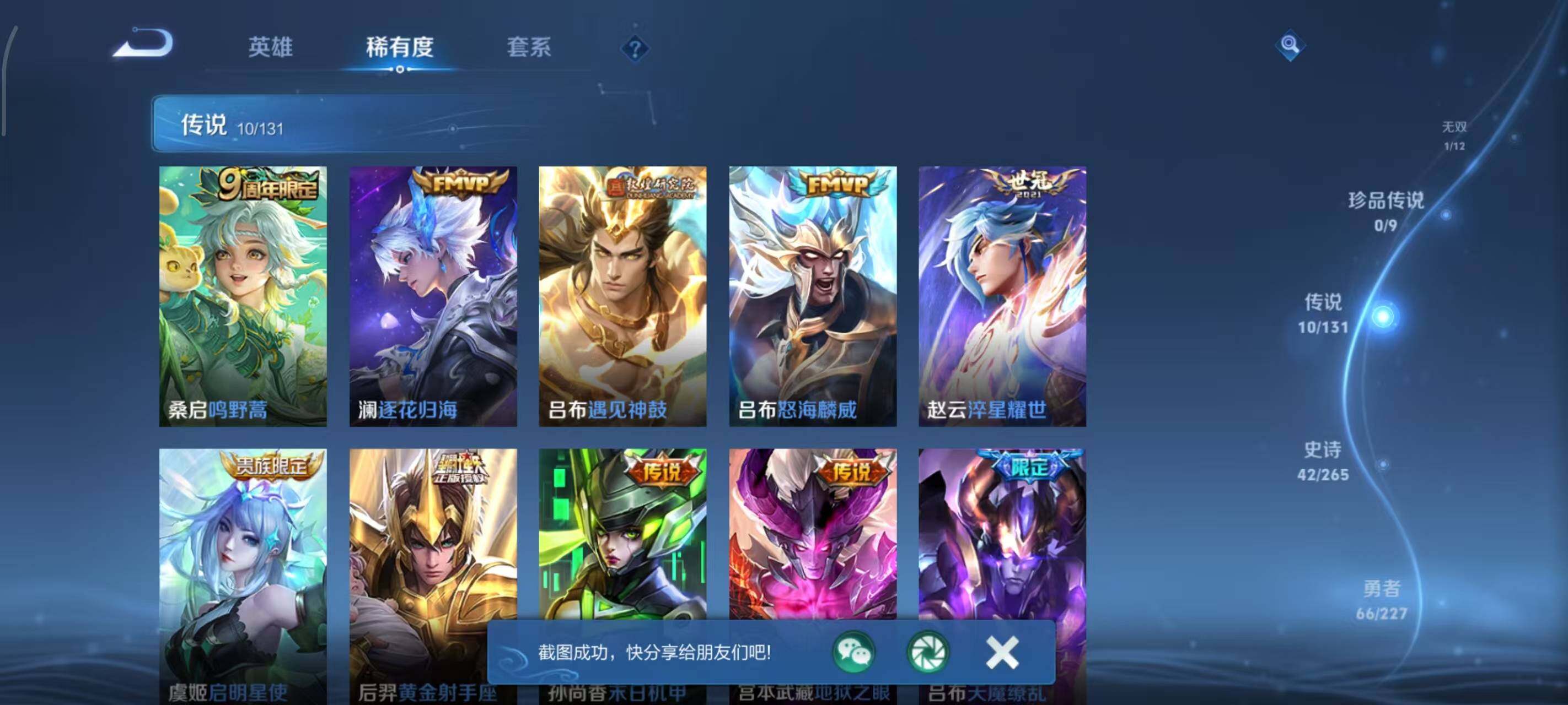 【传说皮肤】:桑启鸣野蒿,澜逐花归海,吕布遇见神鼓,吕布怒海麟威,赵云淬星耀世,虞姬启明星使,后羿黄金射手座,孙尚香末日机甲,宫本武藏地狱之眼,吕布天魔缭乱