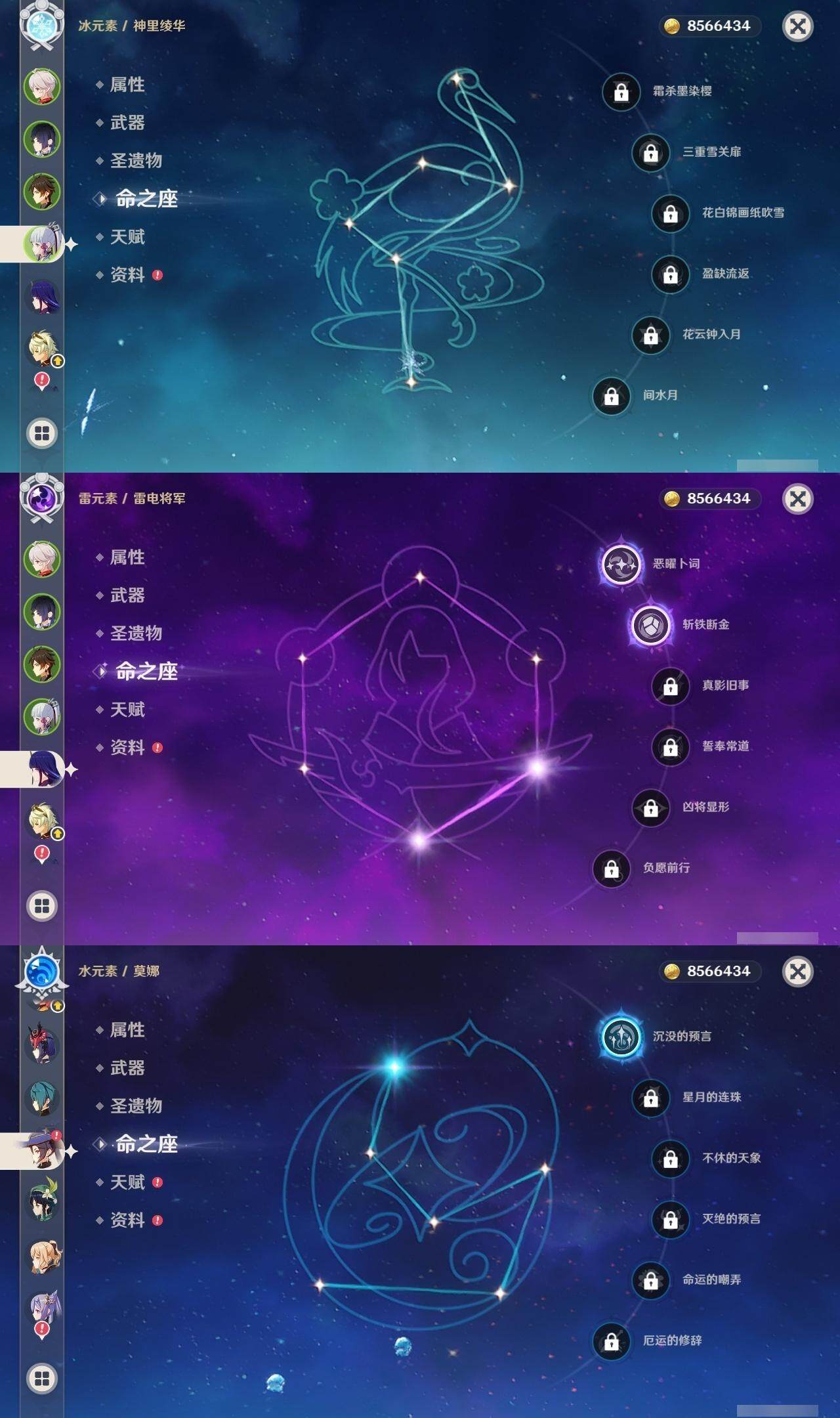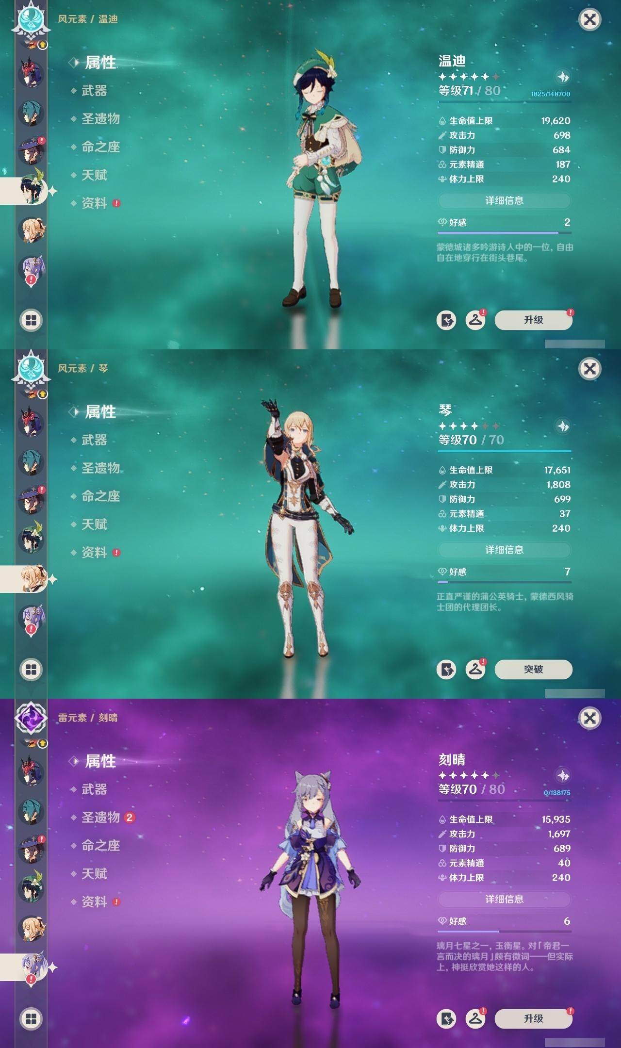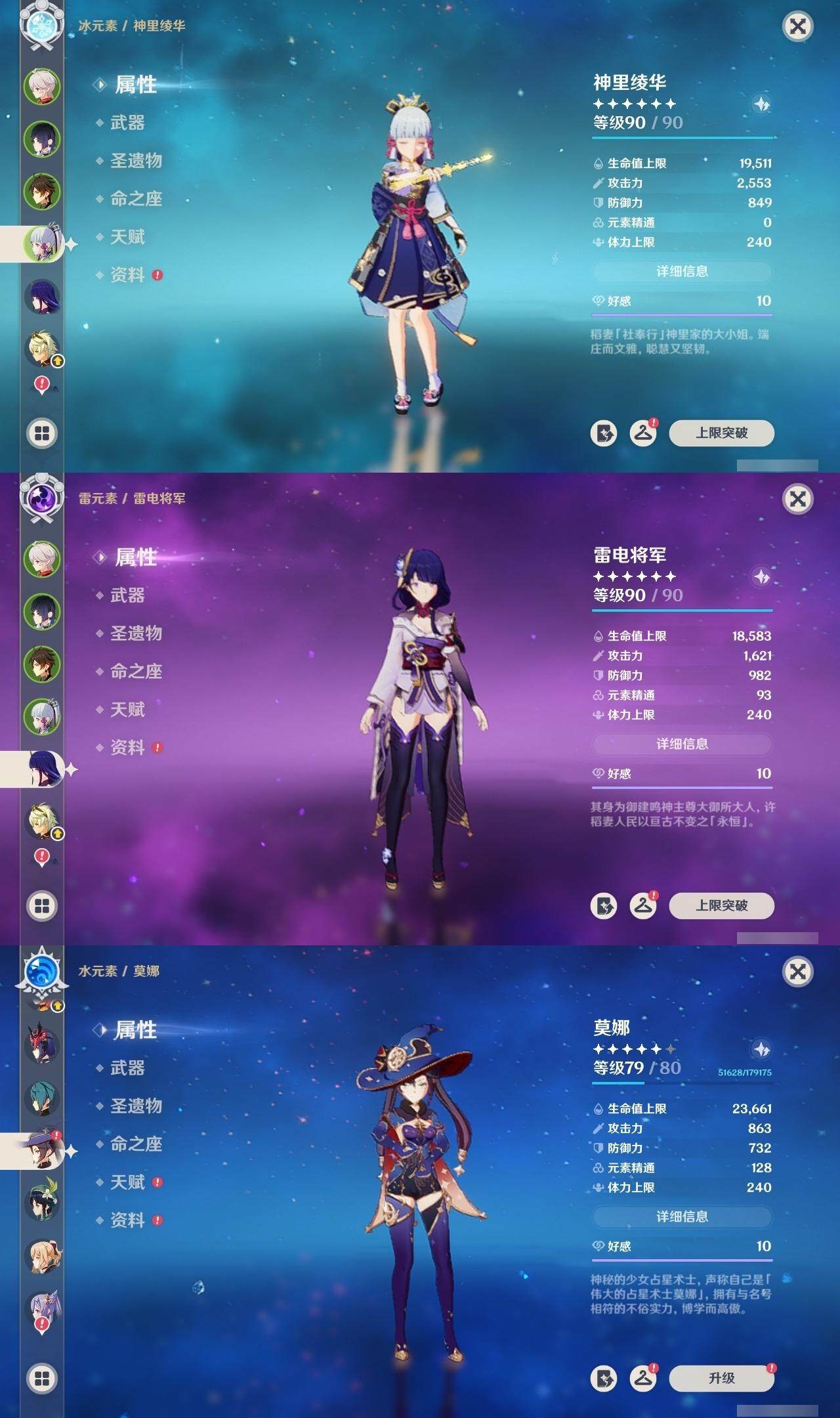 0命夜兰,2命雷电将军,0命枫原万叶,0命神里绫华,0命钟离,0命温迪,0命刻晴,1命琴,1命莫娜,0命迪卢克,0命基尼奇,精1息灾,精1雾切之回光,精1和璞鸢,精1狼的末路