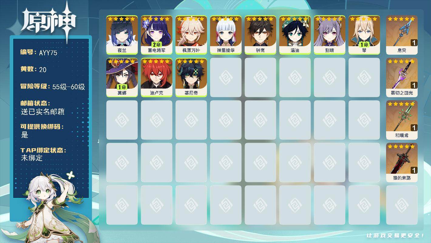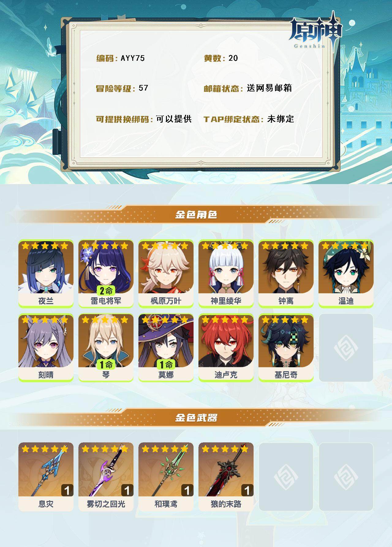 [14760754]57级/20黄/女主/11个五星角色/5个五星武器 0命夜兰,2命雷电将军,0命枫原万叶,0命神里绫华,0命钟离,0命温迪,0命刻晴,1命琴,1命莫娜,0命迪卢克,0命基尼奇,精1息灾,精1雾切之回光,精1和璞鸢,精1狼的末路