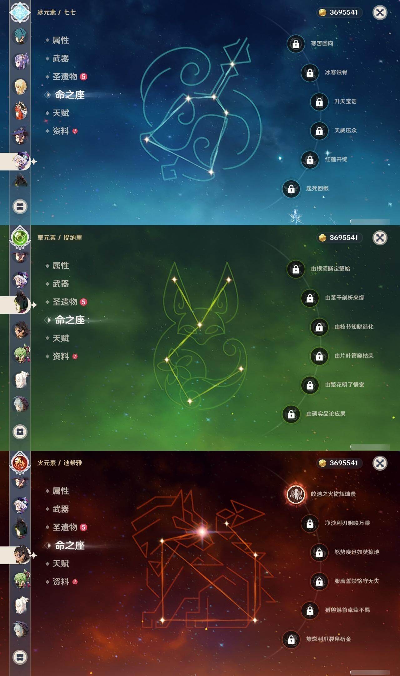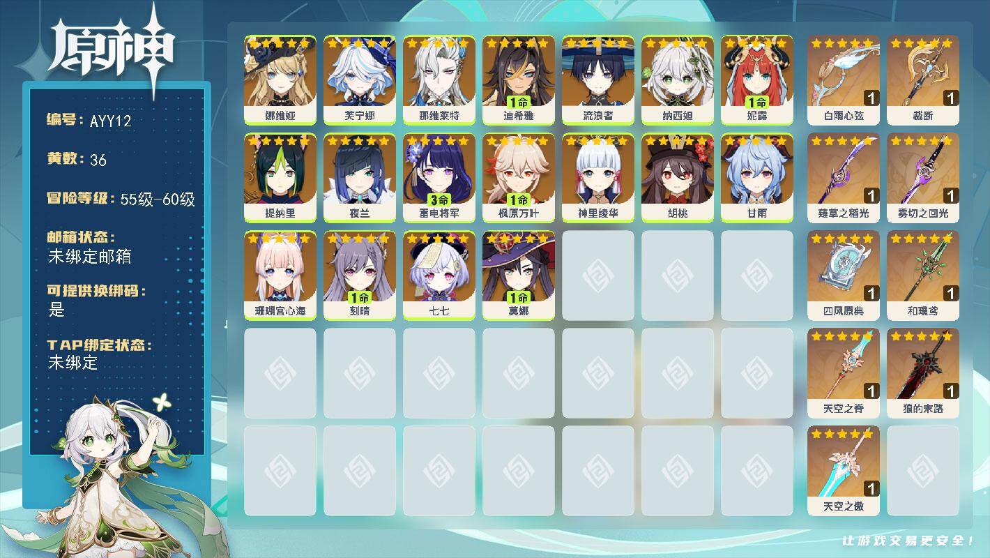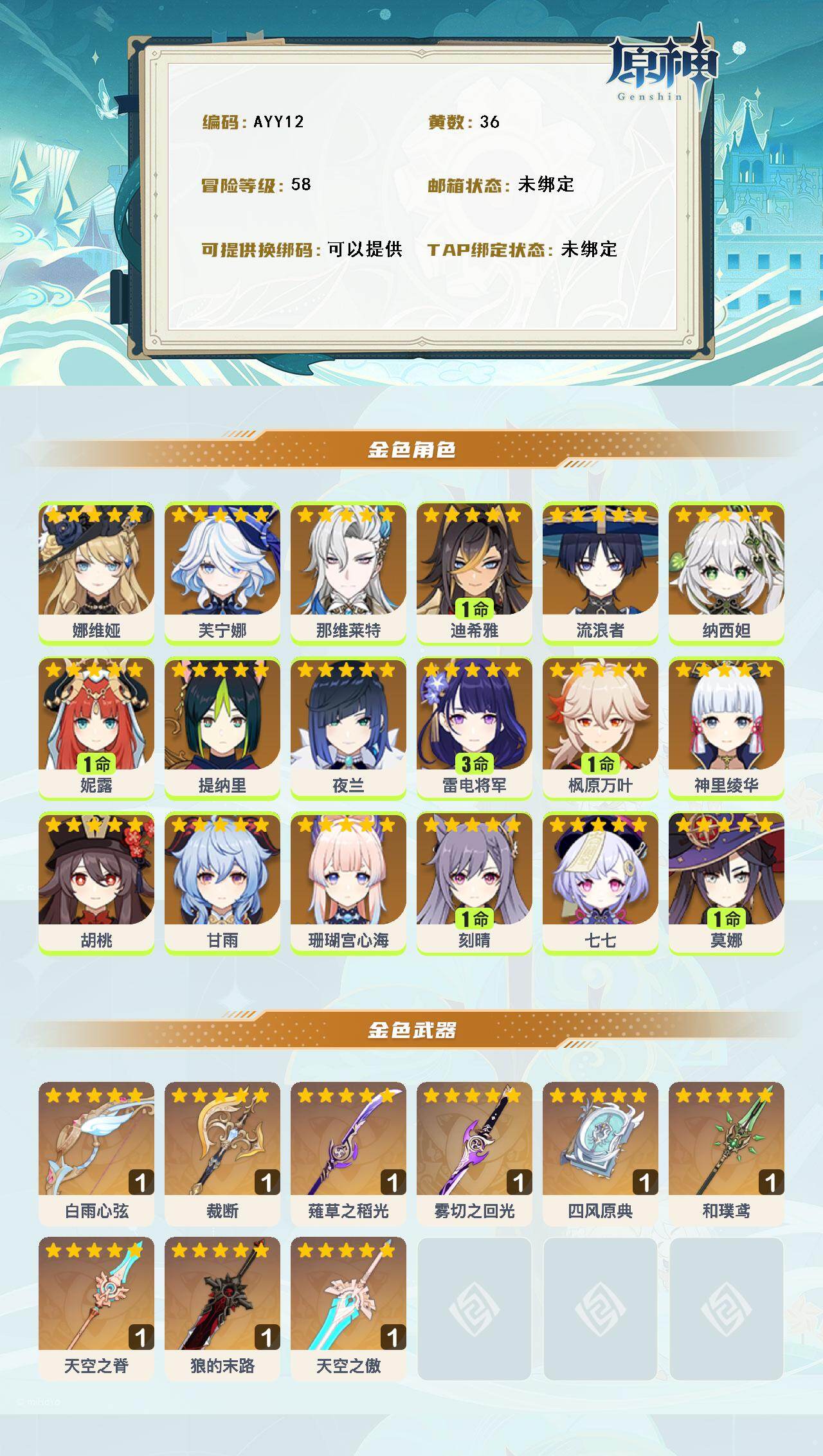 [14760640]58级/36黄/女主/18个五星角色/10个五星武器 0命娜维娅,0命芙宁娜,0命那维莱特,1命迪希雅,0命流浪者,0命纳西妲,1命妮露,0命提纳里,0命夜兰,3命雷电将军,1命枫原万叶,0命神里绫华,0命胡桃,0命甘雨,0命珊瑚宫心海,1命刻晴,0命七七,1命莫娜,精1白雨心弦,精1裁断,精1薙草之稻光,精1雾切之回光,精1四风原典,精1和璞鸢,精1天空之脊,精1狼的末路,精1天空之傲
