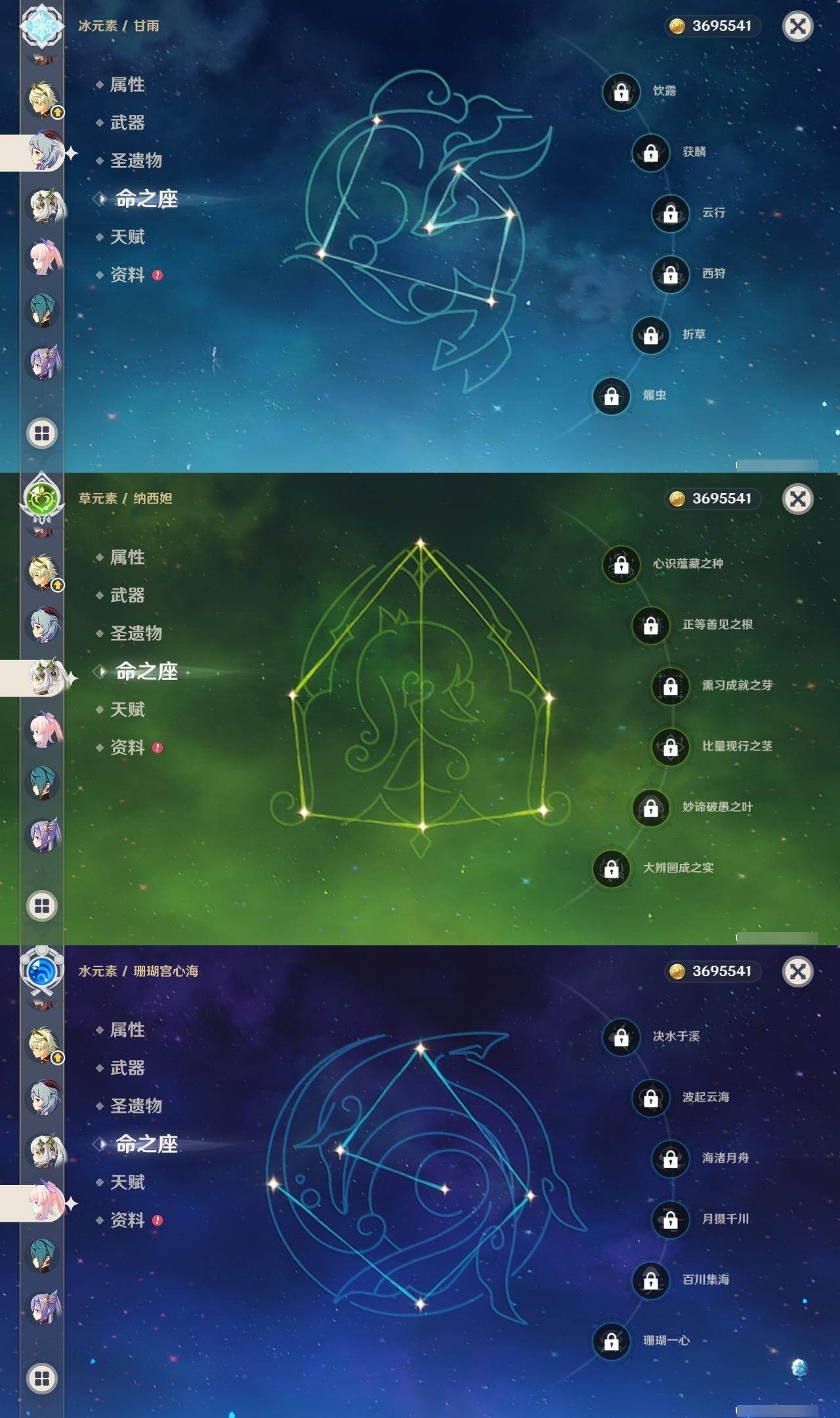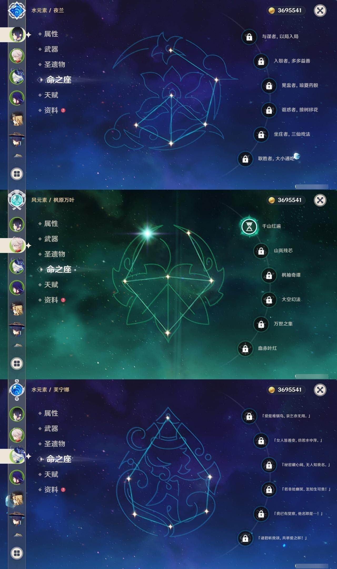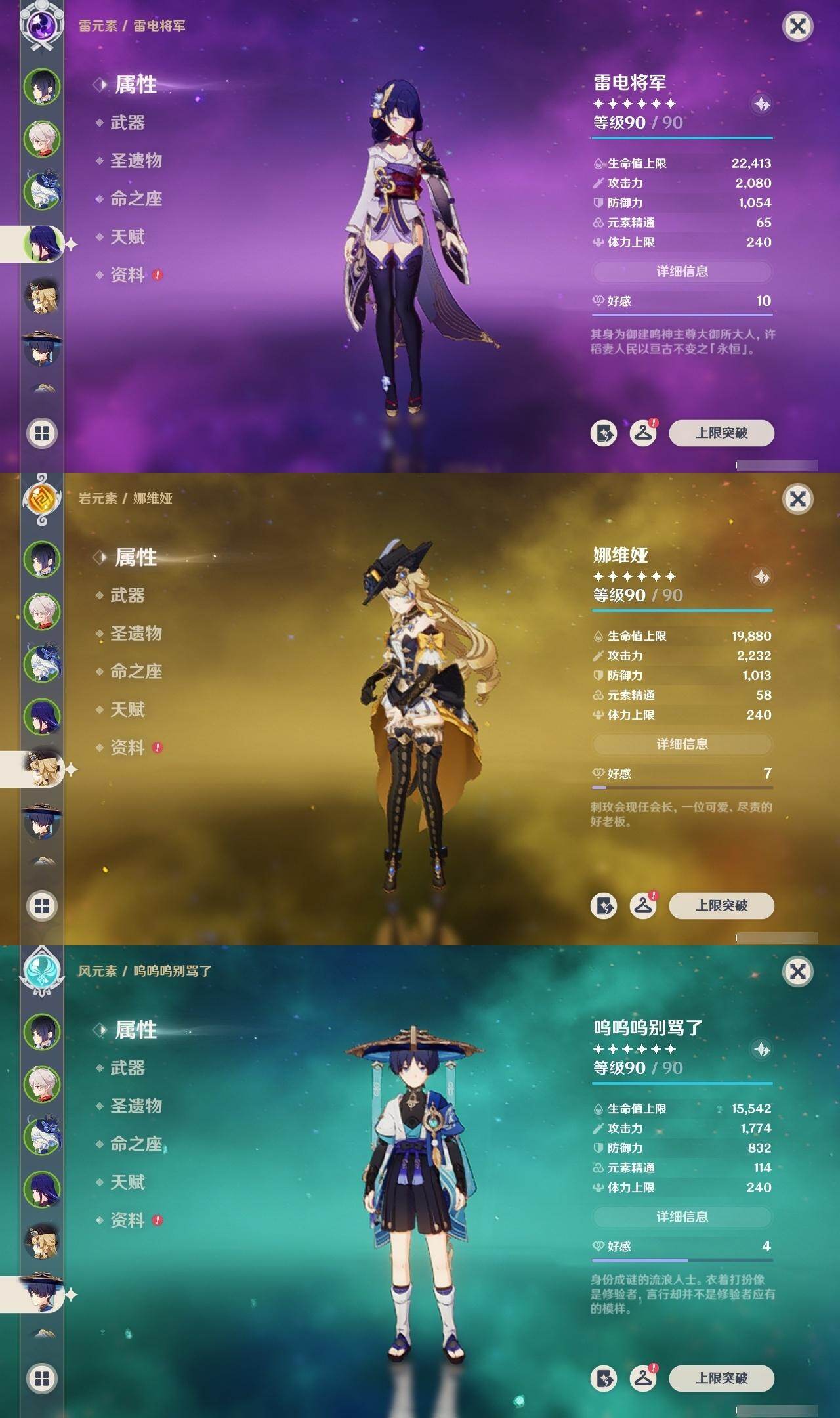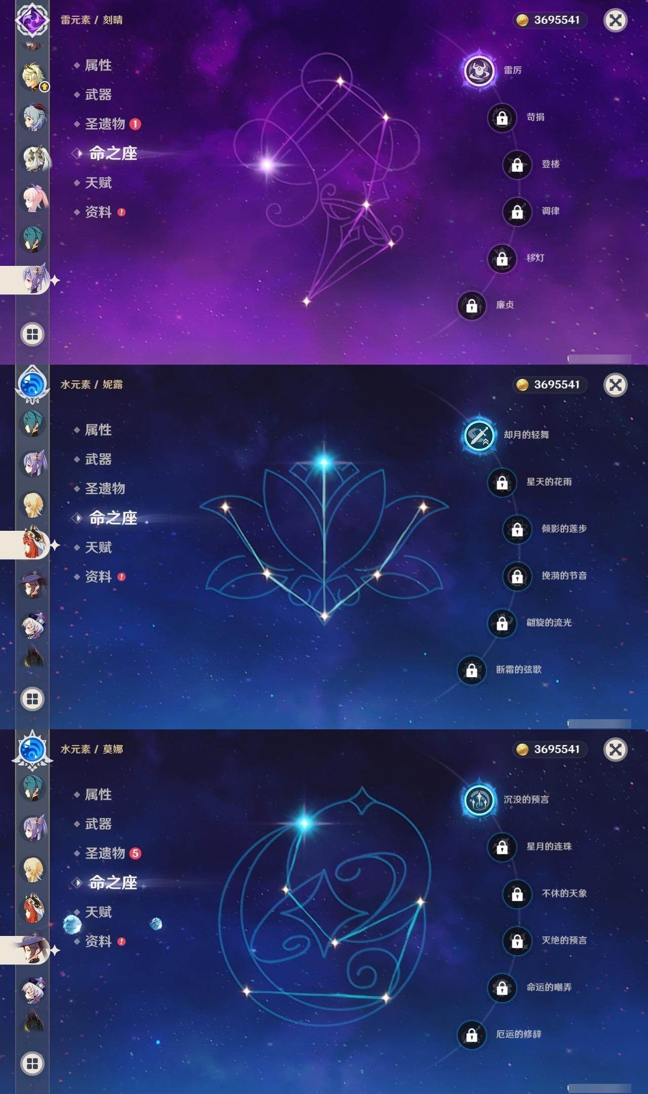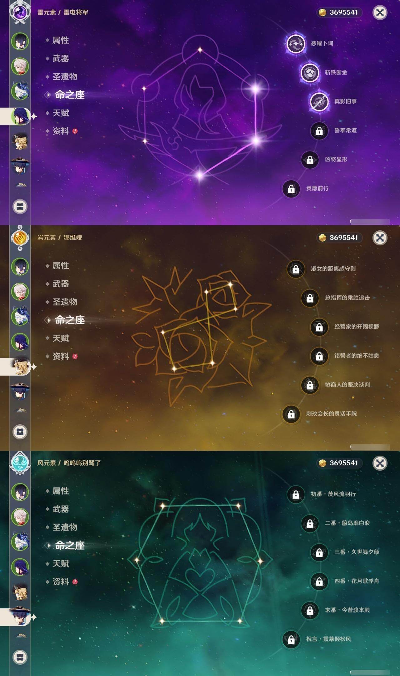 0命娜维娅,0命芙宁娜,0命那维莱特,1命迪希雅,0命流浪者,0命纳西妲,1命妮露,0命提纳里,0命夜兰,3命雷电将军,1命枫原万叶,0命神里绫华,0命胡桃,0命甘雨,0命珊瑚宫心海,1命刻晴,0命七七,1命莫娜,精1白雨心弦,精1裁断,精1薙草之稻光,精1雾切之回光,精1四风原典,精1和璞鸢,精1天空之脊,精1狼的末路,精1天空之傲