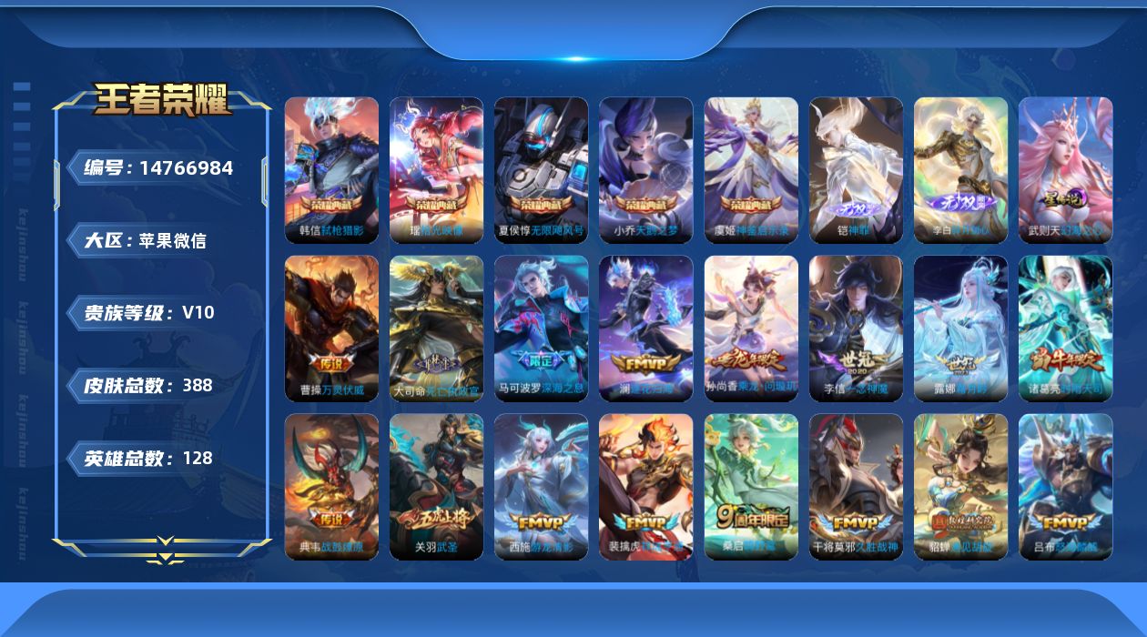 [14766984]苹果WX-V10-仓库一水晶未换-128英雄-388皮肤-5典藏皮肤-1典藏英雄-2无双-32传说-122史诗-64按键-1星元