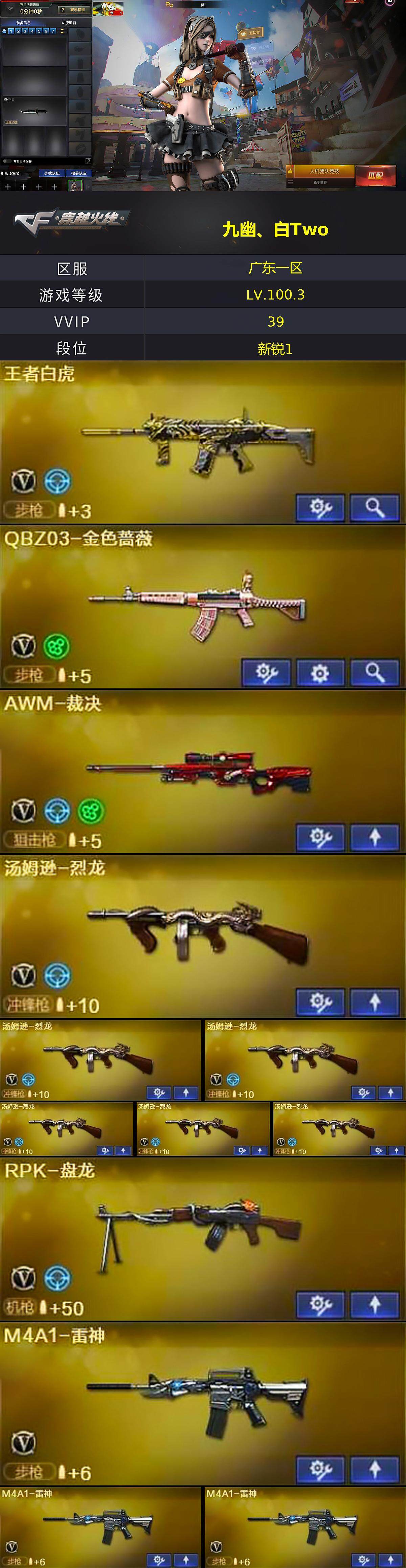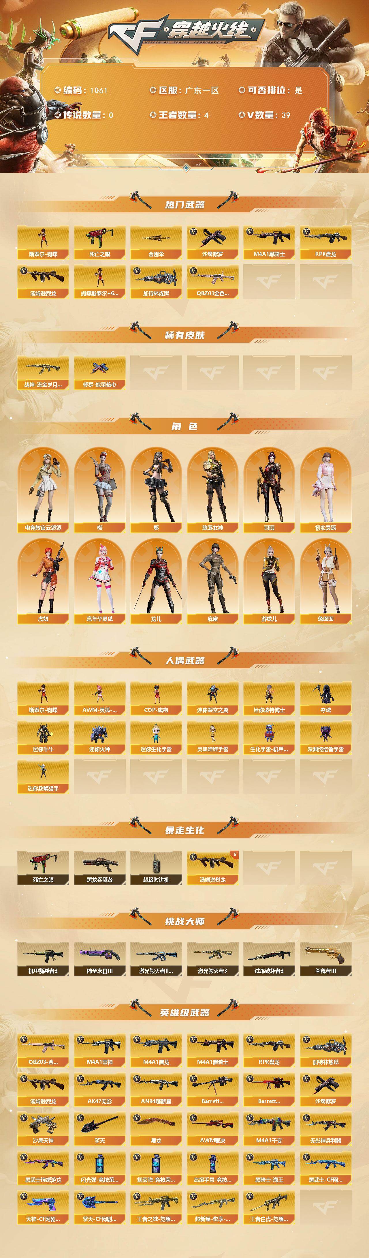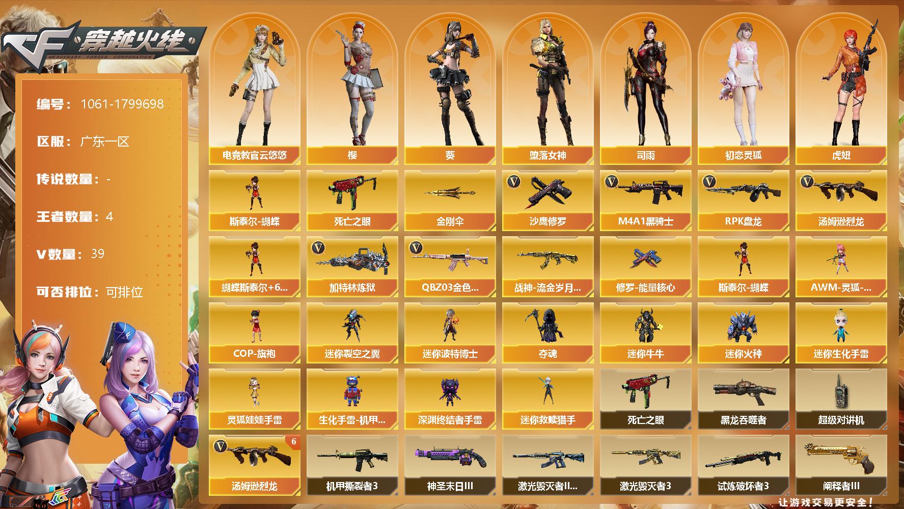 [14756573]广东一区-39V-4王者-0炫金 【热门武器】:QBZ03-金色蔷薇,死亡之眼,M4A1-黑骑士,汤姆逊-烈龙*6,RPK-盘龙,加特林-炼狱*2,斯泰尔-蝴蝶,沙鹰-修罗,金刚伞 【皮肤】:战神-流金岁月皮肤,修罗-能量核心 【角色】:葵,樱,电竞教官-云悠悠,司雨,堕落女神,初恋灵狐,虎妞,嘉年华灵狐,龙儿,麻雀,兔囡囡,游珑儿 【人偶武器】:迷你救赎猎手*2,斯泰尔-蝴蝶,AWM-灵狐-