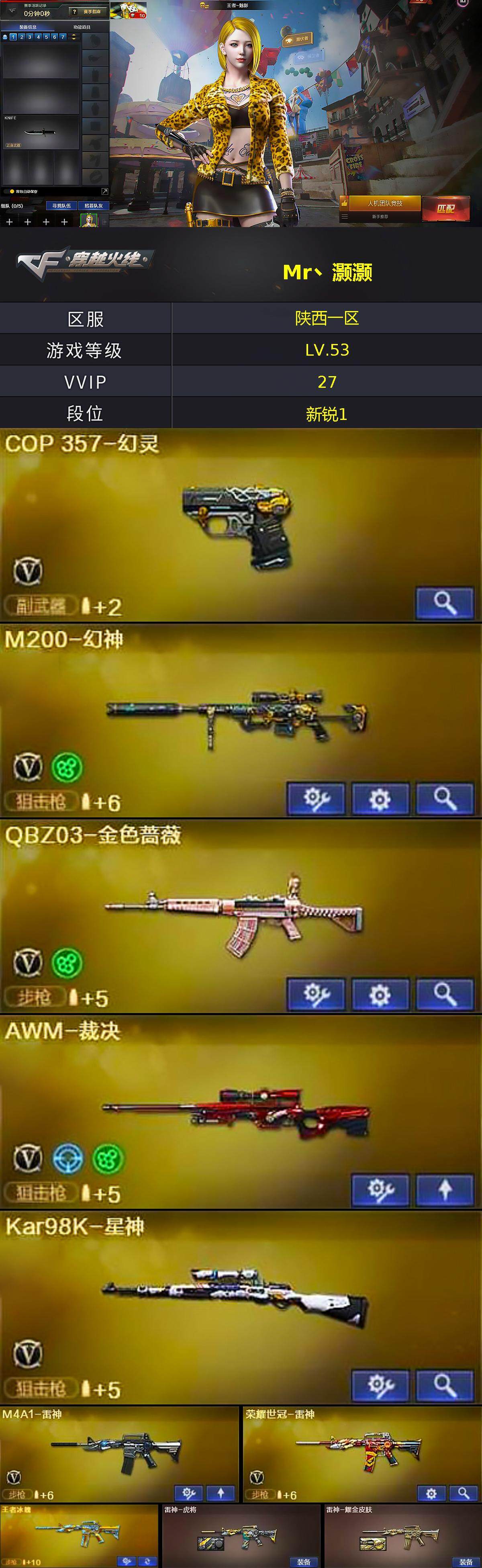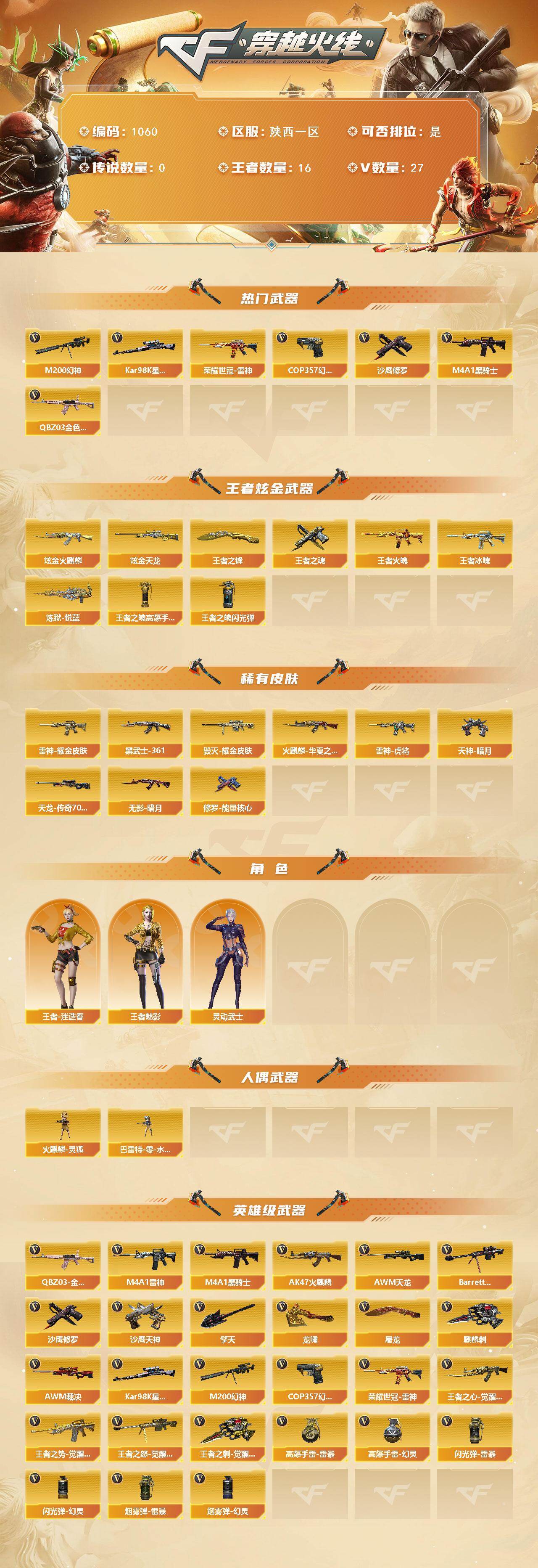[14752487]陕西一区-27V-16王者-2炫金 【热门武器】:QBZ03-金色蔷薇,M200-幻神,荣耀世冠-雷神,Kar98K-星神,M4A1-黑骑士,COP 357-幻灵,沙鹰-修罗*2 【王者炫金武器】:王者冰魄,王者火魄,炼狱-悦蓝,王者之魂,王者之锋*2,炫金火麒麟,炫金天龙,王者之魄高爆手雷*2,王者之魄闪光弹*2 【皮肤】:雷神-虎将,雷神-耀金皮肤,火麒麟-华夏之心,毁灭耀金皮肤,无影-暗月*3,AK47-黑武士-361,AWM-天龙-传奇70KG,修罗-能量核心,天神-暗月*2 【角色】:王者-魅影,王者-迷迭香,灵动武士 【人偶武器】:火麒麟-灵狐,巴雷特-零-水下丽影 【英雄级武器】:AK47-火麒麟,M4A1-雷神,M4A1-黑骑士,QBZ03-金色蔷薇,王者之心-觉醒版,王者之势-觉醒版,荣耀世冠-雷神,AWM-天龙,Barrett-毁灭*3,AWM-裁决,M200-幻神,Kar98K-星神,王者之怒-觉醒版,沙鹰-修罗*2,沙鹰-天神*2,COP 357-幻灵,屠龙,龙啸,擎天,麒麟刺,王者之刺-觉醒版,高爆手雷-雷暴,高爆手雷-幻灵,闪光弹-雷暴,闪光弹-幻灵,烟雾弹-雷暴,烟雾弹-幻灵 【道具】:战舰背包,绿色巨人,灵魂忍者,迷雾幽灵,夺命之镰,防化服,防弹头盔*3,防弹衣*3,C4工具钳*3,手雷包*3 【特殊枪械】:1黑骑士