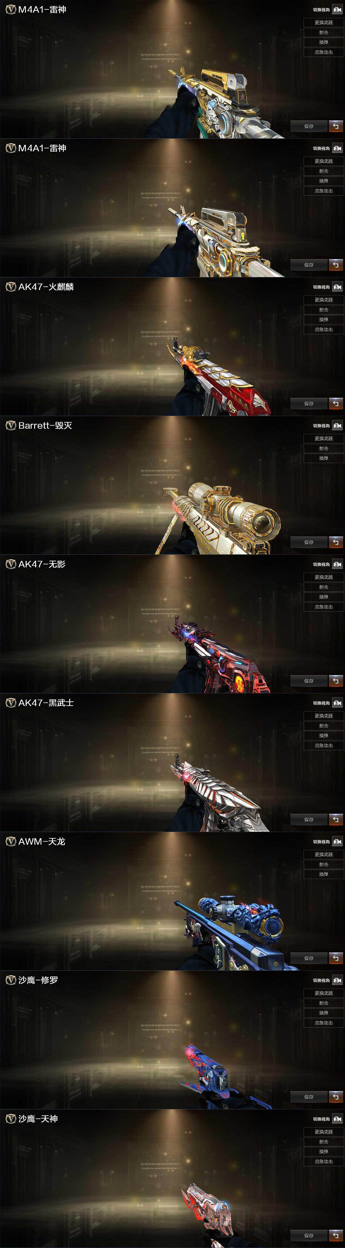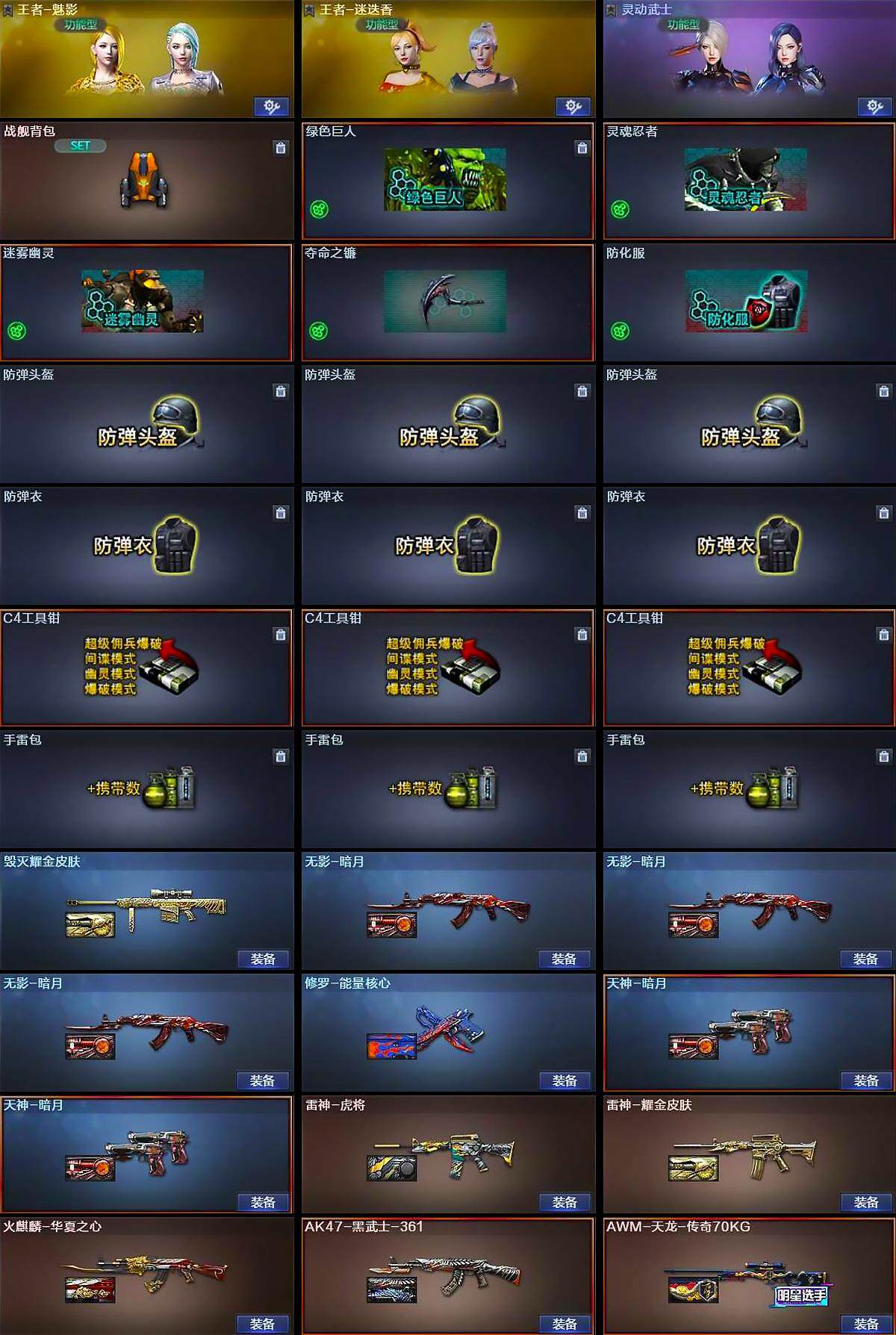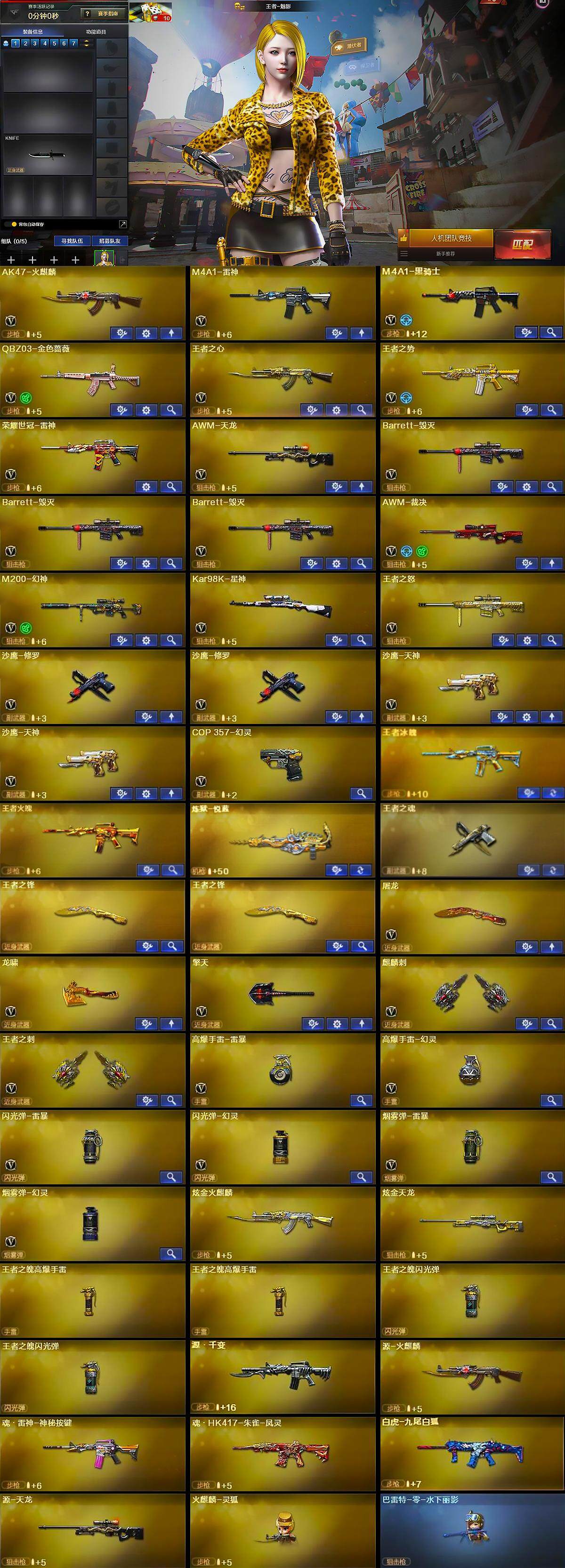 【英雄级武器】:AK47-火麒麟,M4A1-雷神,M4A1-黑骑士,QBZ03-金色蔷薇,王者之心-觉醒版,王者之势-觉醒版,荣耀世冠-雷神,AWM-天龙,Barrett-毁灭*3,AWM-裁决,M200-幻神,Kar98K-星神,王者之怒-觉醒版,沙鹰-修罗*2,沙鹰-天神*2,COP 357-幻灵,屠龙,龙啸,擎天,麒麟刺,王者之刺-觉醒版,高爆手雷-雷暴,高爆手雷-幻灵,闪光弹-雷暴,闪光弹-幻灵,烟雾弹-雷暴,烟雾弹-幻灵