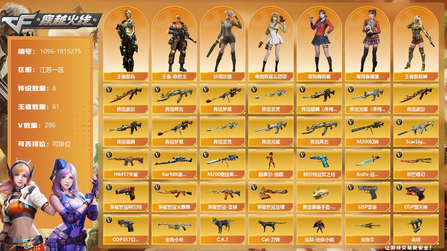 [14771737]江苏一区-286V-61王者-6炫金 【传说武器】:传说光耀(序列号版),传说暗裔(序列号版),传说辉光,传说夜影,传说圣灵,传说梦魇 【传说角色】:传说女帝,传说艾莉莎 【热门武器】:传说光耀,传说暗裔,传说梦魇,传说圣灵,传说夜影,传说辉光,QBZ03-金色蔷薇,M14EBR-玄武,Scar Light-白虎,HK417-朱雀*2,M4A1-青龙,M200-幻神*3,M200-竞技荣光,八