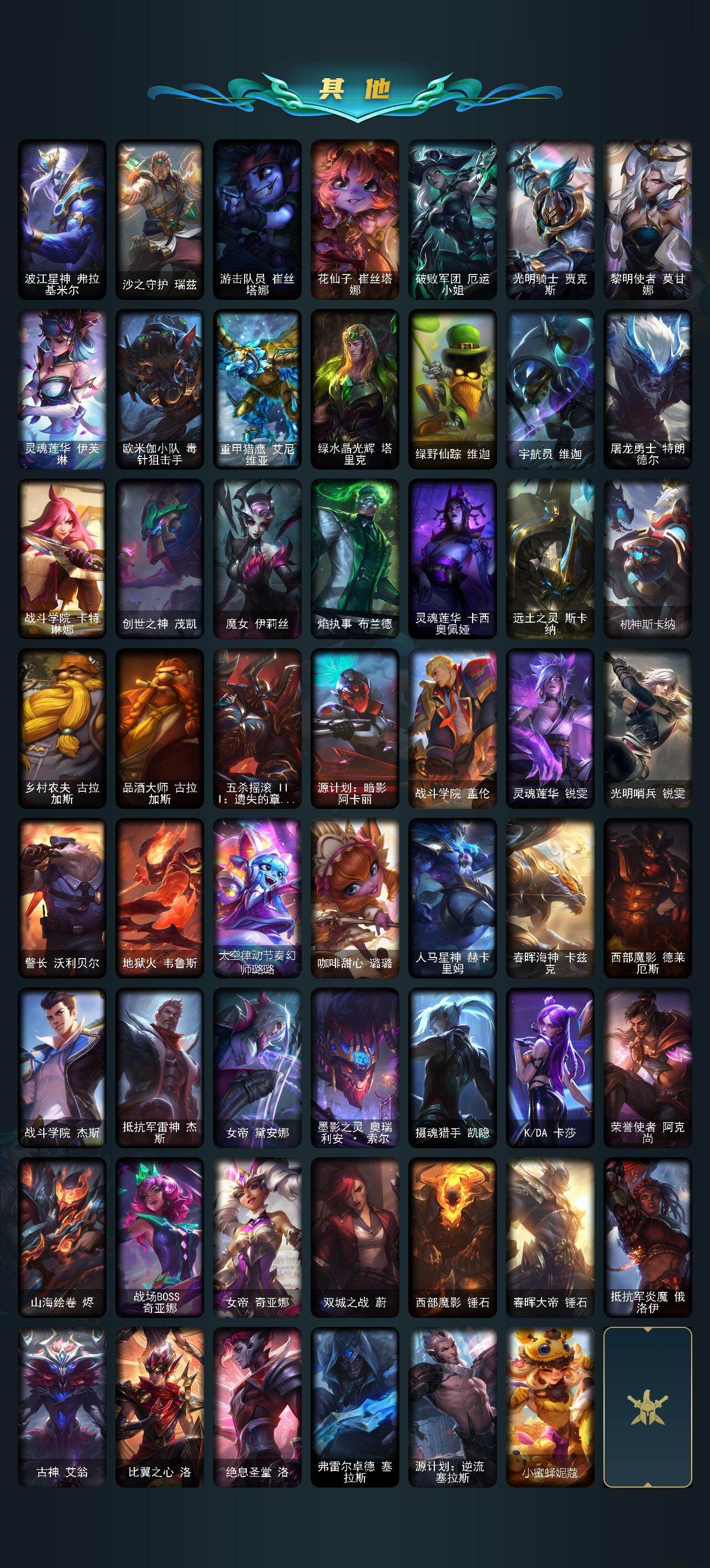 【其他皮肤1】:波江星神弗拉基米尔,沙之守护瑞兹,游击队员崔丝塔娜,花仙子崔丝塔娜,破败军团厄运小姐,光明骑士贾克斯,黎明使者莫甘娜,灵魂莲华伊芙琳,欧米伽小队毒针狙击手,重甲猎鹰艾尼维亚,绿水晶光辉塔里克,绿野仙踪维迦,宇航员维迦,屠龙勇士特朗德尔,战斗学院卡特琳娜,创世之神茂凯,魔女伊莉丝,焰执事布兰德,灵魂莲华卡西奥佩娅,远土之灵斯卡纳,机神斯卡纳,乡村农夫古拉加斯,品酒大师古拉加斯,五杀摇滚III遗失的章节莫德凯撒,源计划暗影阿卡丽,战斗学院盖伦,灵魂莲华锐雯,光明哨兵锐雯,警长沃利贝尔,地狱火韦鲁斯,太空律动节奏幻师璐璐,咖啡甜心璐璐,人马星神赫卡里姆,春晖海神卡兹克,西部魔影德莱厄斯,战斗学院杰斯,抵抗军雷神杰斯,女帝黛安娜,墨影之灵奥瑞利安索尔,摄魂猎手凯隐,KDA卡莎,荣誉使者阿克尚,山海绘卷烬,战场BOSS奇亚娜,
