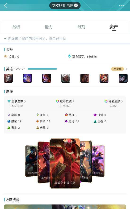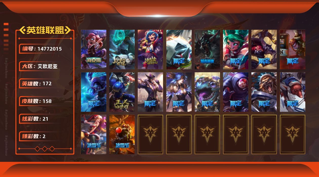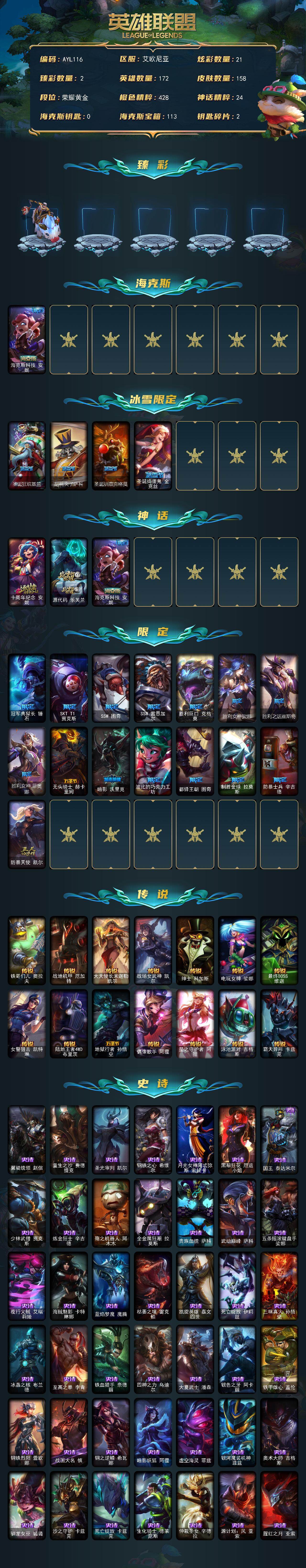 黄金段位-172英雄-158皮肤-21炫彩-0终极-3神话-19限定-14传说-45史诗