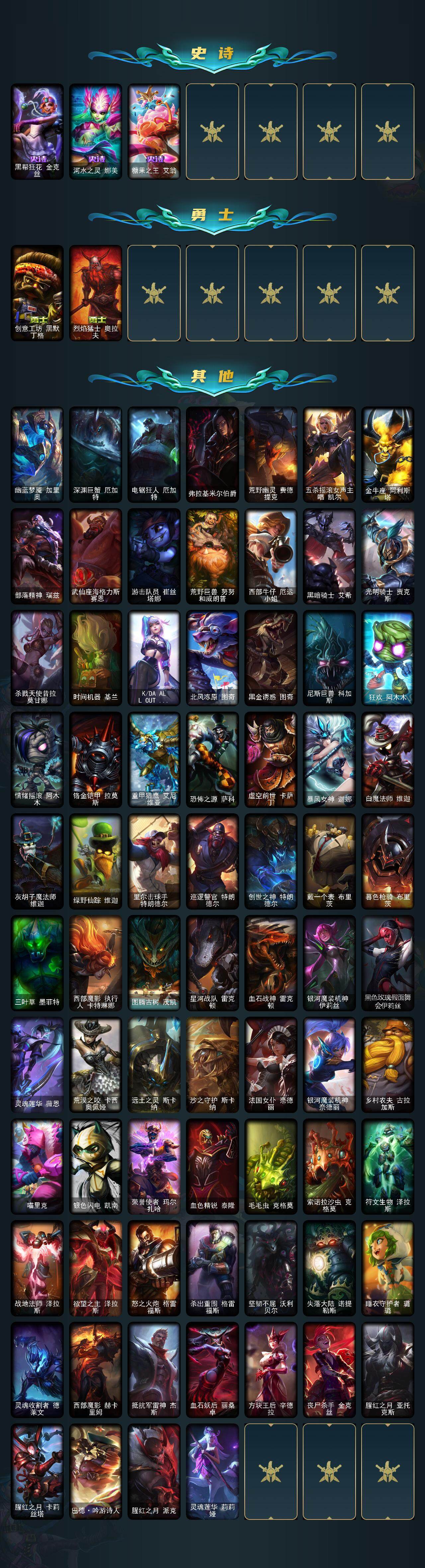 【史诗皮肤】:翼骑统领赵信,重生之沙费德提克,圣光审判凯尔,钢铁之心希维尔,月光女神阿忒弥斯索拉卡,黑帮狂花厄运小姐,国王泰达米尔,少林武僧贾克斯,炼金狂士辛吉德,殇之机器人阿木木,全金属狂潮拉莫斯,贵族血统萨科,武动巅峰萨科,五杀摇滚键盘手娑娜,夜行义贼艾瑞莉娅,海贼魅影卡特琳娜,蓝焰梦魔魔腾,枯萎之壤雷克顿,凯旋英雄嘉文四世,死亡绽放伊莉丝,三昧真火孙悟空,冰晶之核布兰德,至高之拳李青,铁血猎手奈德丽,四神之力乌迪尔,大夏武士潘森,银色之牙阿卡丽,铁甲雄心盖伦,钢铁烈阳蕾欧娜,战国大名慎,钢之逆鳞希瓦娜,暗影妖狐阿狸,虚空海灵菲兹,银河魔装机神菲兹,奥术大师吉格斯,驯龙女巫璐璐,沙之守护卡兹克,死亡绽放卡兹克,生化骑士德莱厄斯,仲裁圣女辛德拉,源计划风亚索,腥红之月亚索,黑帮狂花金克丝,河水之灵娜美,糖果之王艾翁