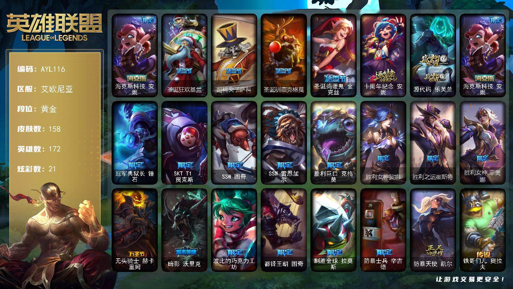 [14772015]可二次【店主推荐捡漏号!可直接换绑】 黄金段位-172英雄-158皮肤-21炫彩-0终极-3神话-19限定-14传说-45史诗 【臻彩皮肤】:无畏骑士瑟庄妮赤子初心,魔女阿卡丽虚荣 【海克斯皮肤】:海克斯科技安妮 【冰雪限定】:圣诞狂欢基兰,胡桃夹子萨科,圣诞驯鹿克格莫,圣诞捣蛋鬼金克丝 【神话皮肤】:十周年纪念安妮,源代码乐芙兰,海克斯科技安妮 【限定皮肤】:冠军典狱长锤石,SKTT1贾克斯,SSW图奇,SSW雷恩加尔,胜利巨口克格莫,胜利女神娑娜,胜利之运崔斯特,胜利女神菲奥娜,无头骑士赫卡里姆,暗影沃里克,波比的巧克力工坊,都铎王朝图奇,制胜金球拉莫斯,防暴士兵辛吉德,防暴天使凯尔 【传说皮肤】:铁哥们儿奥拉夫,战地机甲厄加特,大天使长米迦勒凯尔,战场女武神凯尔,绅士科加斯,电玩女神娑娜,最终BOSS维迦,女警狙击凯特琳,陆地王者4WD布里茨,地狱行者孙悟空,偶像歌手阿狸,星之守护者阿狸,泳池派对吉格斯,霸天异形卡兹克 【史诗皮肤】:翼骑统领赵信,重生之沙费德提克,圣光审判凯尔,钢铁之心希维尔,月光女神阿忒弥斯索拉卡,黑帮狂花厄运小姐,国王泰达米尔,少林武僧贾克斯,炼金狂士辛吉德,殇之机器人阿木木,全金属狂潮拉莫斯,贵族血统萨科,武动巅峰萨科,五杀摇滚键盘手娑娜,夜行义贼艾瑞莉娅,海贼魅影卡特琳娜,蓝焰梦魔魔腾,枯萎之壤雷克顿,凯旋英雄嘉文四世,死亡绽放伊莉丝,三昧真火孙悟空,冰晶之核布兰德,至高之拳李青,铁血猎手奈德丽,四神之力乌迪尔,大夏武士潘森,银色之牙阿卡丽,铁甲雄心盖伦,钢铁烈阳蕾欧娜,战国大名慎,钢之逆鳞希瓦娜,暗影妖狐阿狸,虚空海灵菲兹,银河魔装机神菲兹,奥术大师吉格斯,驯龙女巫璐璐,沙之守护卡兹克,死亡绽放卡兹克,生化骑士德莱厄斯,仲裁圣女辛德拉,源计划风亚索,腥红之月亚索,黑帮狂花金克丝,河水之灵娜美,糖果之王艾翁 【勇士皮肤】:创意工坊黑默丁格,烈焰猛士奥拉夫 【其他皮肤1】:幽蓝梦魇加里奥,深渊巨蟹厄加特,电锯狂人厄加特,弗拉基米尔伯爵,荒野幽灵费德提克,五杀摇滚女声主唱凯尔,金牛座阿利斯塔,部落精神瑞兹,武仙座海格力斯赛恩,游击队员崔丝塔娜,荒野巨兽努努和威朗普,西部牛仔厄运小姐,黑暗骑士艾希,光明骑士贾克斯,杀戮天使昔拉莫甘娜,时间机器基兰,KDAALLOUT伊芙琳,北风冻原图奇,黑金诱惑图奇,尼斯巨兽科加斯,狂欢阿木木,情绪摇滚阿