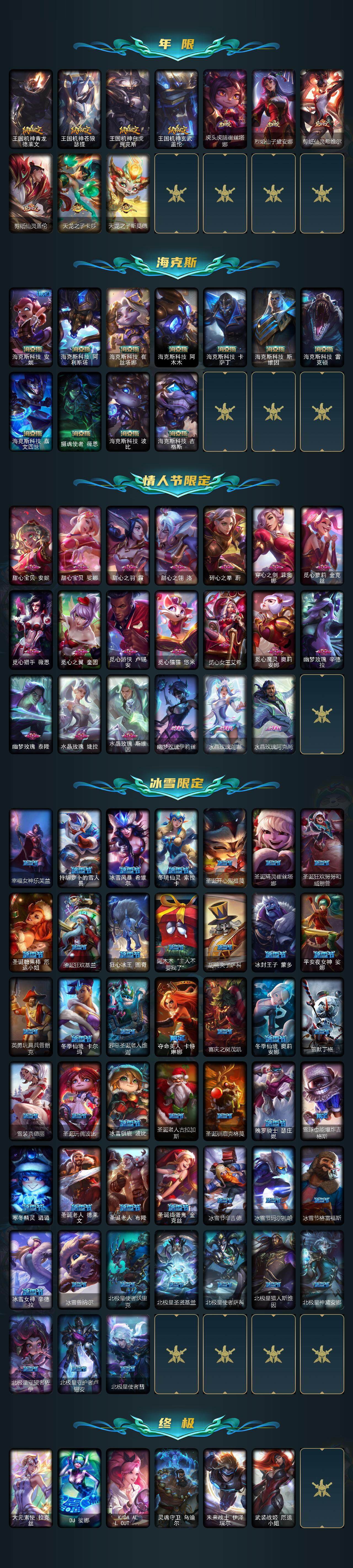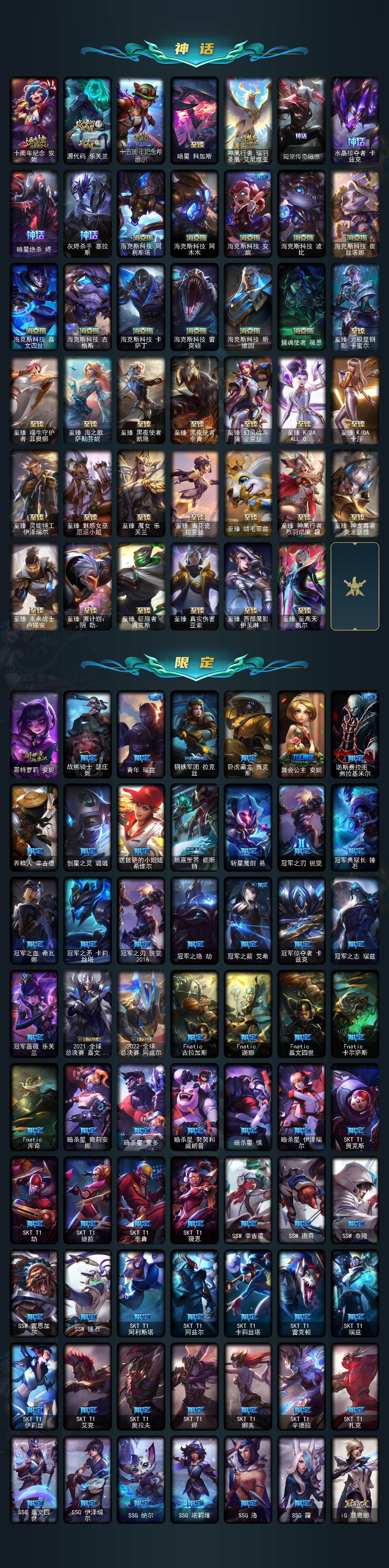 【年限皮肤】:龙的传人李青,银龙裁决泰隆,古琴余韵娑娜,定海神珍孙悟空,你看见过我的熊猫吗安妮,碧玉之牙卡西奥佩娅,