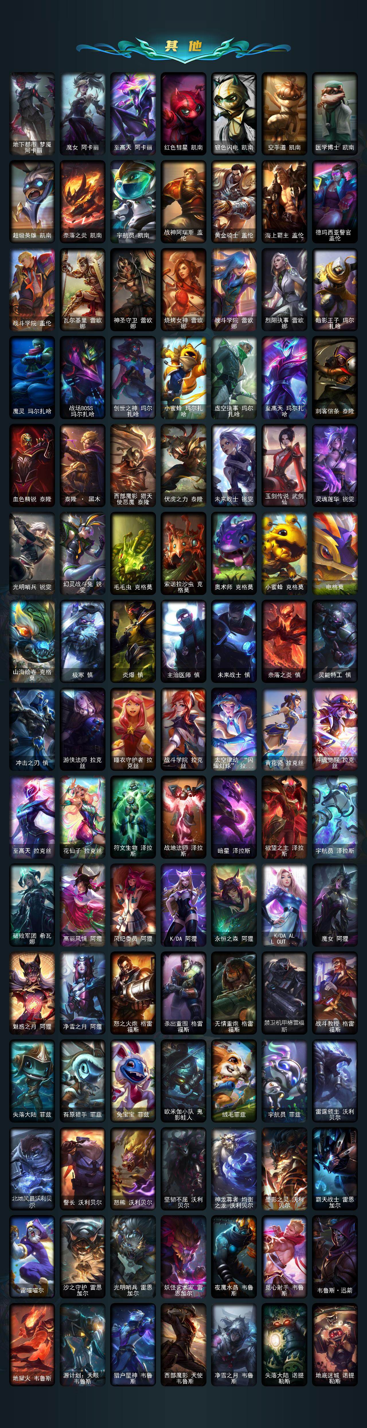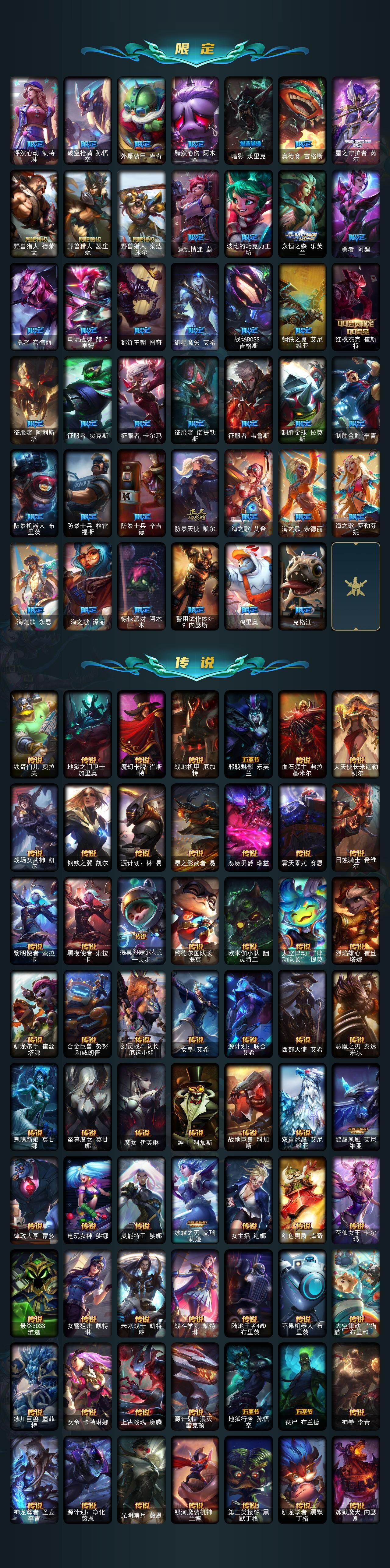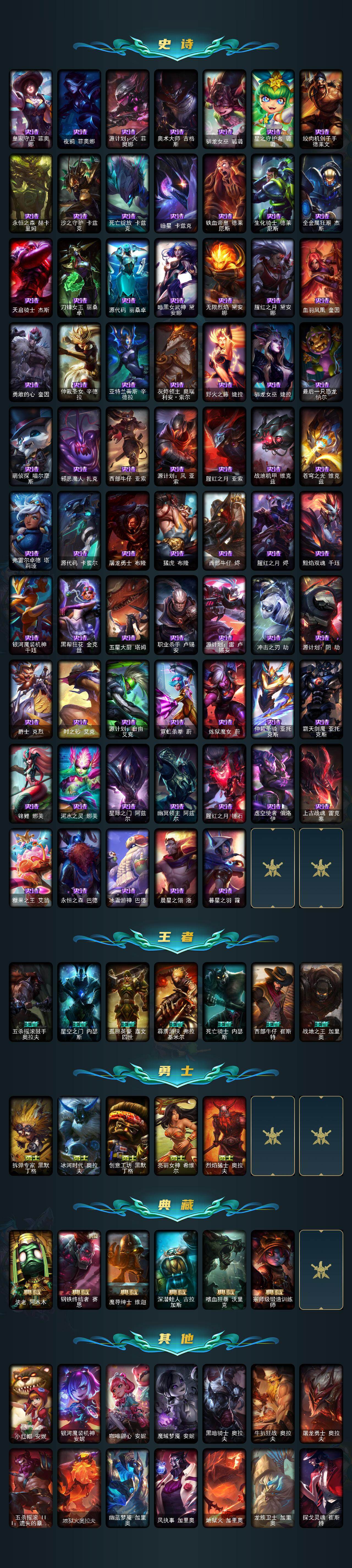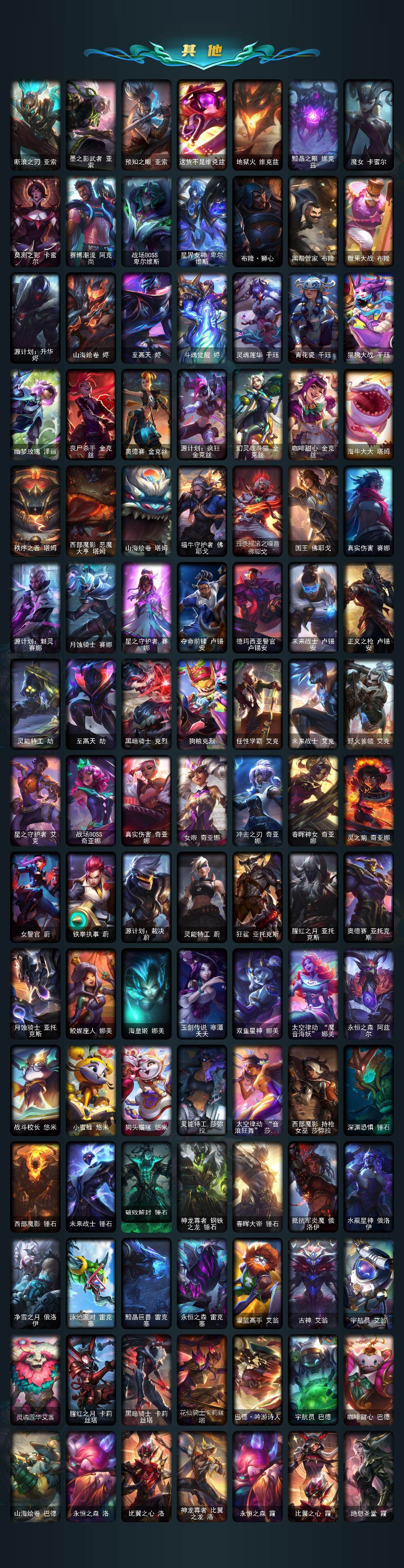 【臻彩皮肤】:龙的传人李青飞龙在天,天龙之子卡莎云起龙骧,剪纸仙灵嘉文四世日进斗金,天龙之子卡莎飞龙乘云,无畏竞巅峰薇恩,巅峰剑仙菲奥娜天神下凡,无畏猎手卡莎极境飞跃,无畏圣弩薇恩绝境狂杀,巅峰之拳瑟提明镜止水,无畏游侠卢锡安不败圣枪,无畏骑士瑟庄妮赤子初心,无畏意志墨菲特必不可挡,巅峰魅影乐芙兰神龙之影,巅峰猫咪悠米凯旋辅卫,巅峰星灵佐伊飞星破梦,冠军之箭艾希凯旋圣装,吕布奉先炫金战神,张辽文远炫金将军,冰霜之刃艾瑞莉娅炫金,冰雪节格雷福斯炫金,赵云子龙炫金将军,墨之影武者亚索金墨耀影,冠军掠夺者卡兹克凯旋圣装,冠军之隐劫凯旋圣装,墨之影武者易金墨耀影,雾雨之刃锐雯,神龙尊者圣龙李青龙腾云起,墨之影武者永恩云墨漾影,神龙尊者圣龙李青登龙,真实伤害艾克无畏之志,弹幕天使卡莎炽天使勇敢,女帝卡特琳娜纹章之刻印英勇,黎明使者薇恩虹辉,星之守护者金克丝黑洞,弹幕天使卡莎炽天使公正,幻灵战斗蝠薇恩梦幻强袭,源计划火菲奥娜惩戒,咖啡甜心波比焦糖布丁,魔女阿卡丽虚荣,净雪之月莫甘娜冬虹,幻灵战斗兔阿萝拉梦幻强袭,红莲之刃锐雯,预知之眼亚索不怠,心之钢伊泽瑞尔锐意曲风,北极星钢影卡蜜尔智慧纽带,心之钢伊泽瑞尔天纵才华,北极星使者彗圣洁光带