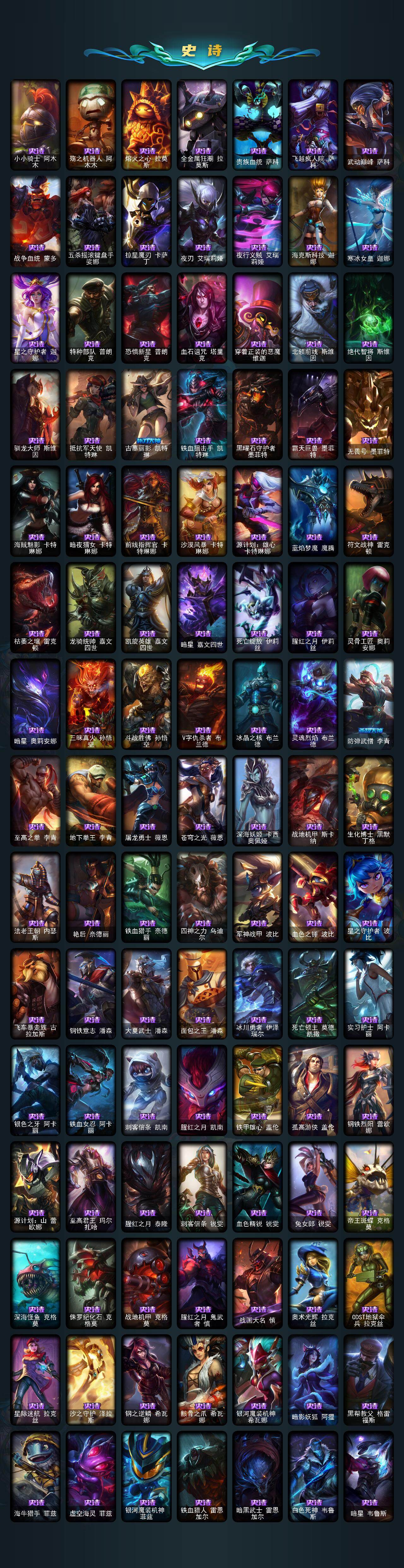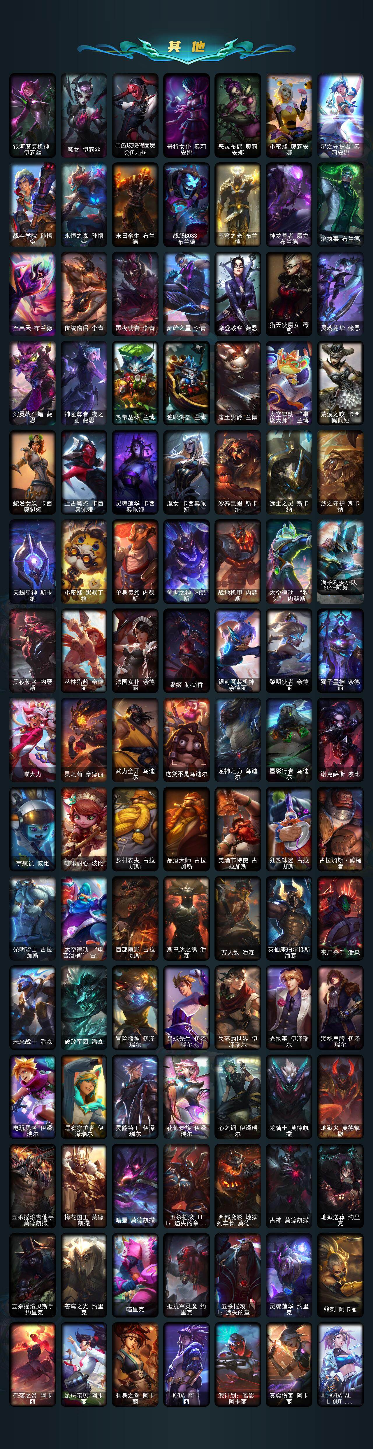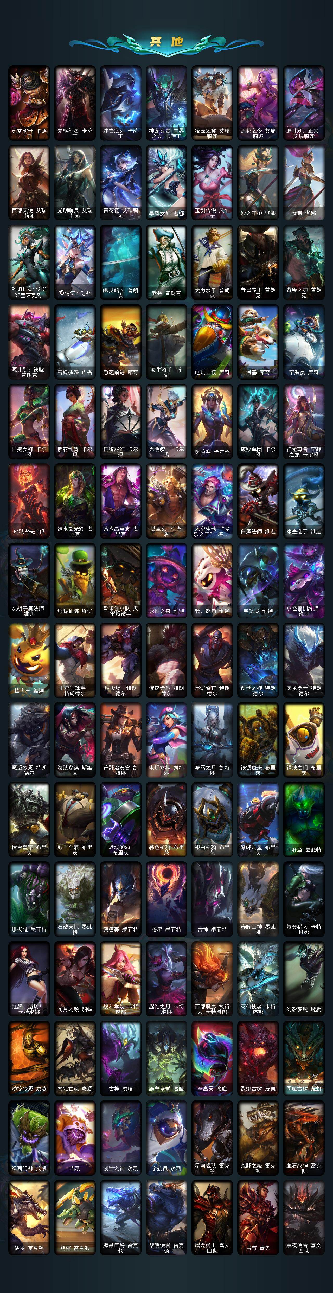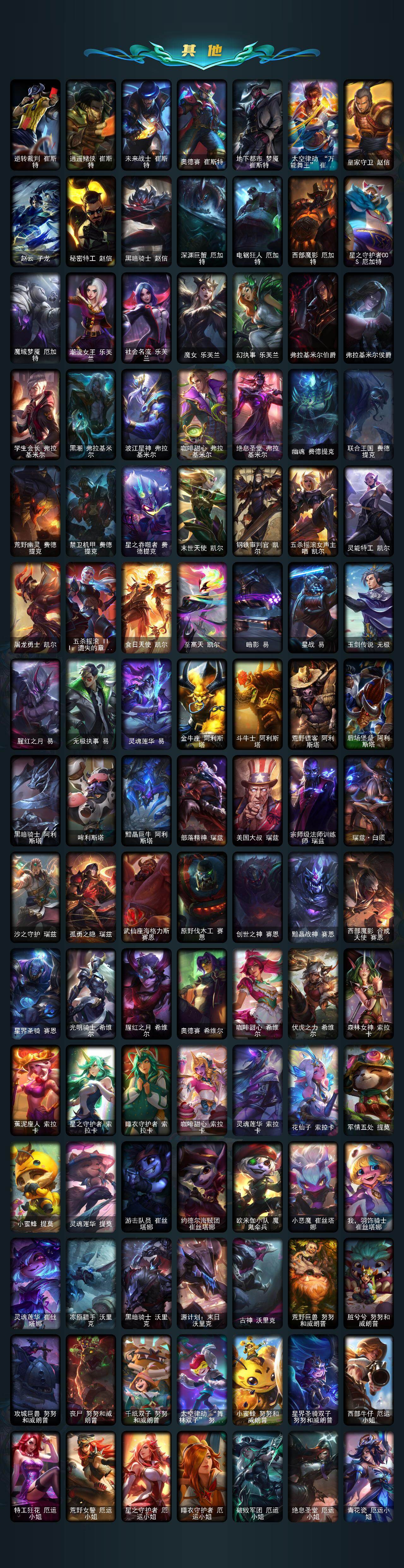 【臻彩皮肤】:龙的传人李青飞龙在天,天龙之子卡莎云起龙骧,剪纸仙灵嘉文四世日进斗金,天龙之子卡莎飞龙乘云,无畏竞巅峰薇恩,巅峰剑仙菲奥娜天神下凡,无畏猎手卡莎极境飞跃,无畏圣弩薇恩绝境狂杀,巅峰之拳瑟提明镜止水,无畏游侠卢锡安不败圣枪,无畏骑士瑟庄妮赤子初心,无畏意志墨菲特必不可挡,巅峰魅影乐芙兰神龙之影,巅峰猫咪悠米凯旋辅卫,巅峰星灵佐伊飞星破梦,冠军之箭艾希凯旋圣装,吕布奉先炫金战神,张辽文远炫金将军,冰霜之刃艾瑞莉娅炫金,冰雪节格雷福斯炫金,赵云子龙炫金将军,墨之影武者亚索金墨耀影,冠军掠夺者卡兹克凯旋圣装,冠军之隐劫凯旋圣装,墨之影武者易金墨耀影,雾雨之刃锐雯,神龙尊者圣龙李青龙腾云起,墨之影武者永恩云墨漾影,神龙尊者圣龙李青登龙,真实伤害艾克无畏之志,弹幕天使卡莎炽天使勇敢,女帝卡特琳娜纹章之刻印英勇,黎明使者薇恩虹辉,星之守护者金克丝黑洞,弹幕天使卡莎炽天使公正,幻灵战斗蝠薇恩梦幻强袭,源计划火菲奥娜惩戒,咖啡甜心波比焦糖布丁,魔女阿卡丽虚荣,净雪之月莫甘娜冬虹,幻灵战斗兔阿萝拉梦幻强袭,红莲之刃锐雯,预知之眼亚索不怠,心之钢伊泽瑞尔锐意曲风,北极星钢影卡蜜尔智慧纽带,心之钢伊泽瑞尔天纵才华,北极星使者彗圣洁光带
