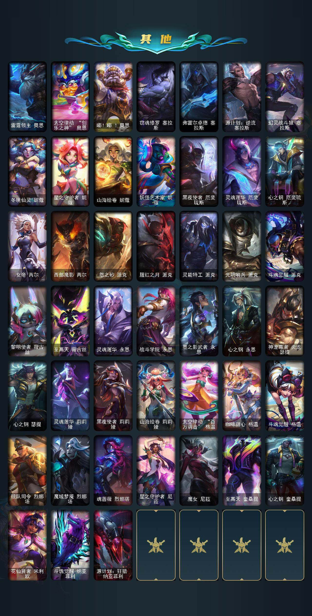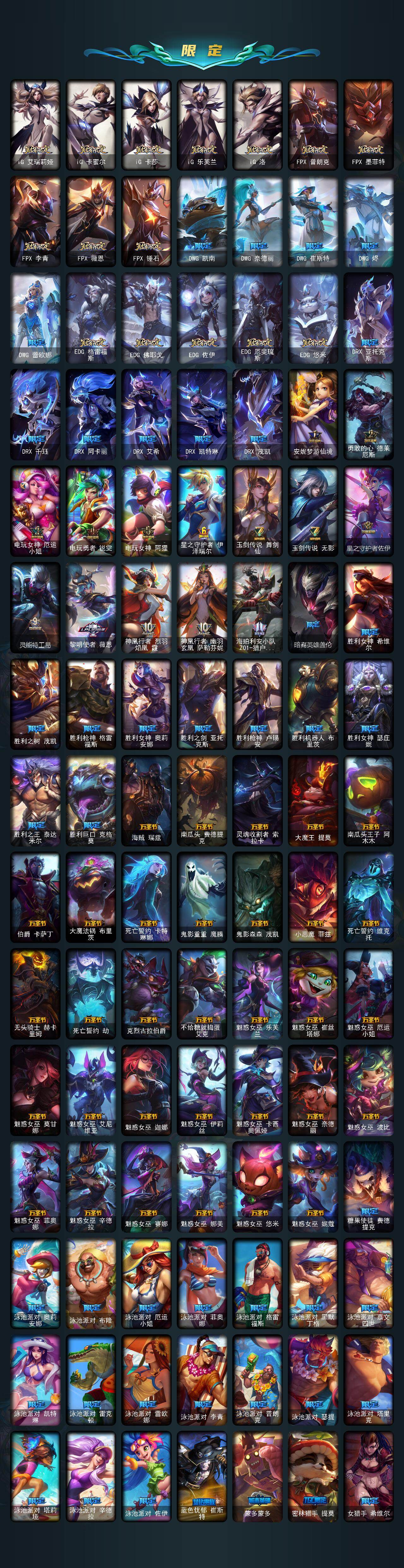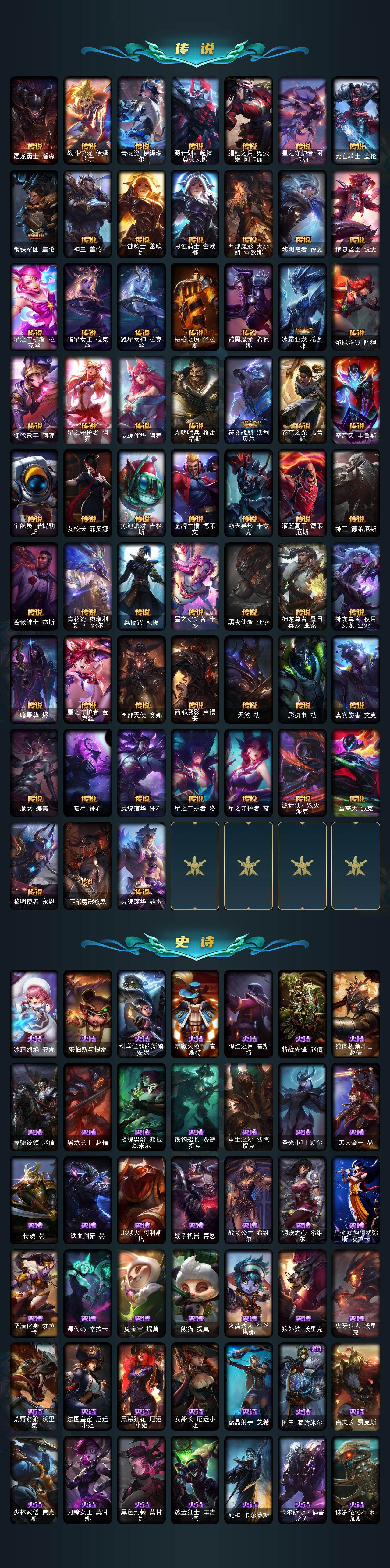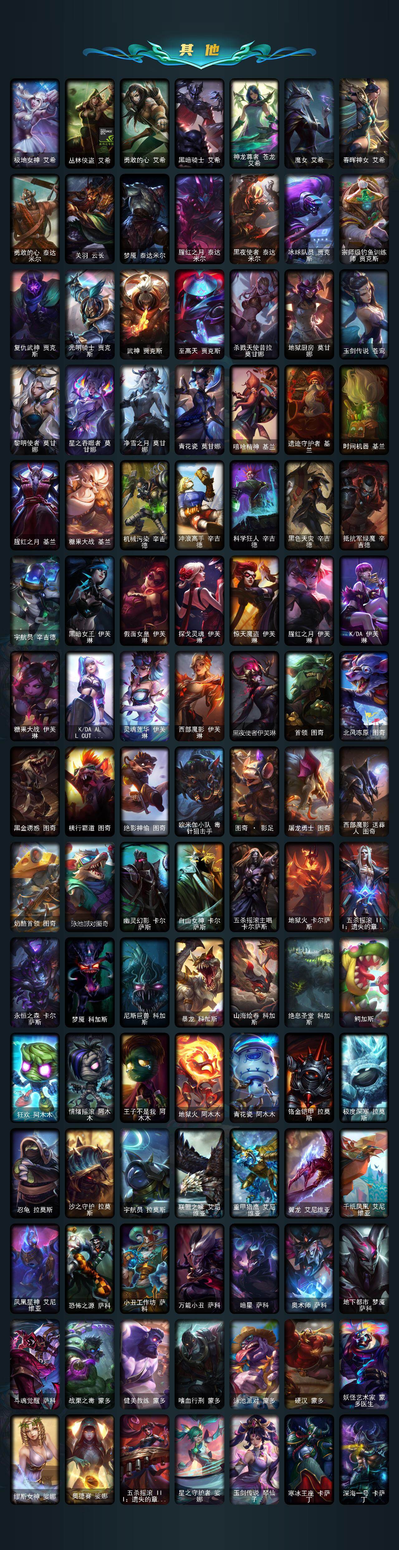 【臻彩皮肤】:龙的传人李青飞龙在天,天龙之子卡莎云起龙骧,剪纸仙灵嘉文四世日进斗金,天龙之子卡莎飞龙乘云,无畏竞巅峰薇恩,巅峰剑仙菲奥娜天神下凡,无畏猎手卡莎极境飞跃,无畏圣弩薇恩绝境狂杀,巅峰之拳瑟提明镜止水,无畏游侠卢锡安不败圣枪,无畏骑士瑟庄妮赤子初心,无畏意志墨菲特必不可挡,巅峰魅影乐芙兰神龙之影,巅峰猫咪悠米凯旋辅卫,巅峰星灵佐伊飞星破梦,冠军之箭艾希凯旋圣装,吕布奉先炫金战神,张辽文远炫金将军,冰霜之刃艾瑞莉娅炫金,冰雪节格雷福斯炫金,赵云子龙炫金将军,墨之影武者亚索金墨耀影,冠军掠夺者卡兹克凯旋圣装,冠军之隐劫凯旋圣装,墨之影武者易金墨耀影,雾雨之刃锐雯,神龙尊者圣龙李青龙腾云起,墨之影武者永恩云墨漾影,神龙尊者圣龙李青登龙,真实伤害艾克无畏之志,弹幕天使卡莎炽天使勇敢,女帝卡特琳娜纹章之刻印英勇,黎明使者薇恩虹辉,星之守护者金克丝黑洞,弹幕天使卡莎炽天使公正,幻灵战斗蝠薇恩梦幻强袭,源计划火菲奥娜惩戒,咖啡甜心波比焦糖布丁,魔女阿卡丽虚荣,净雪之月莫甘娜冬虹,幻灵战斗兔阿萝拉梦幻强袭,红莲之刃锐雯,预知之眼亚索不怠,心之钢伊泽瑞尔锐意曲风,北极星钢影卡蜜尔智慧纽带,心之钢伊泽瑞尔天纵才华,北极星使者彗圣洁光带