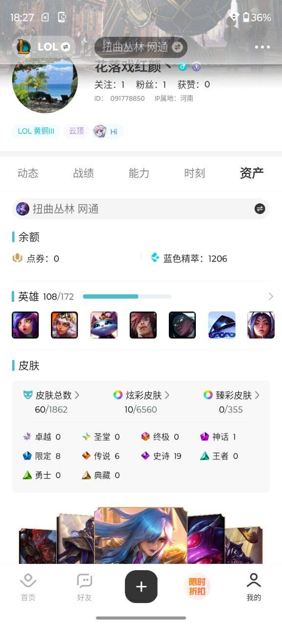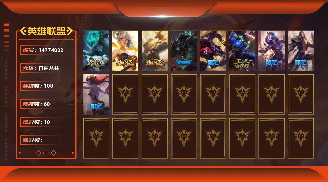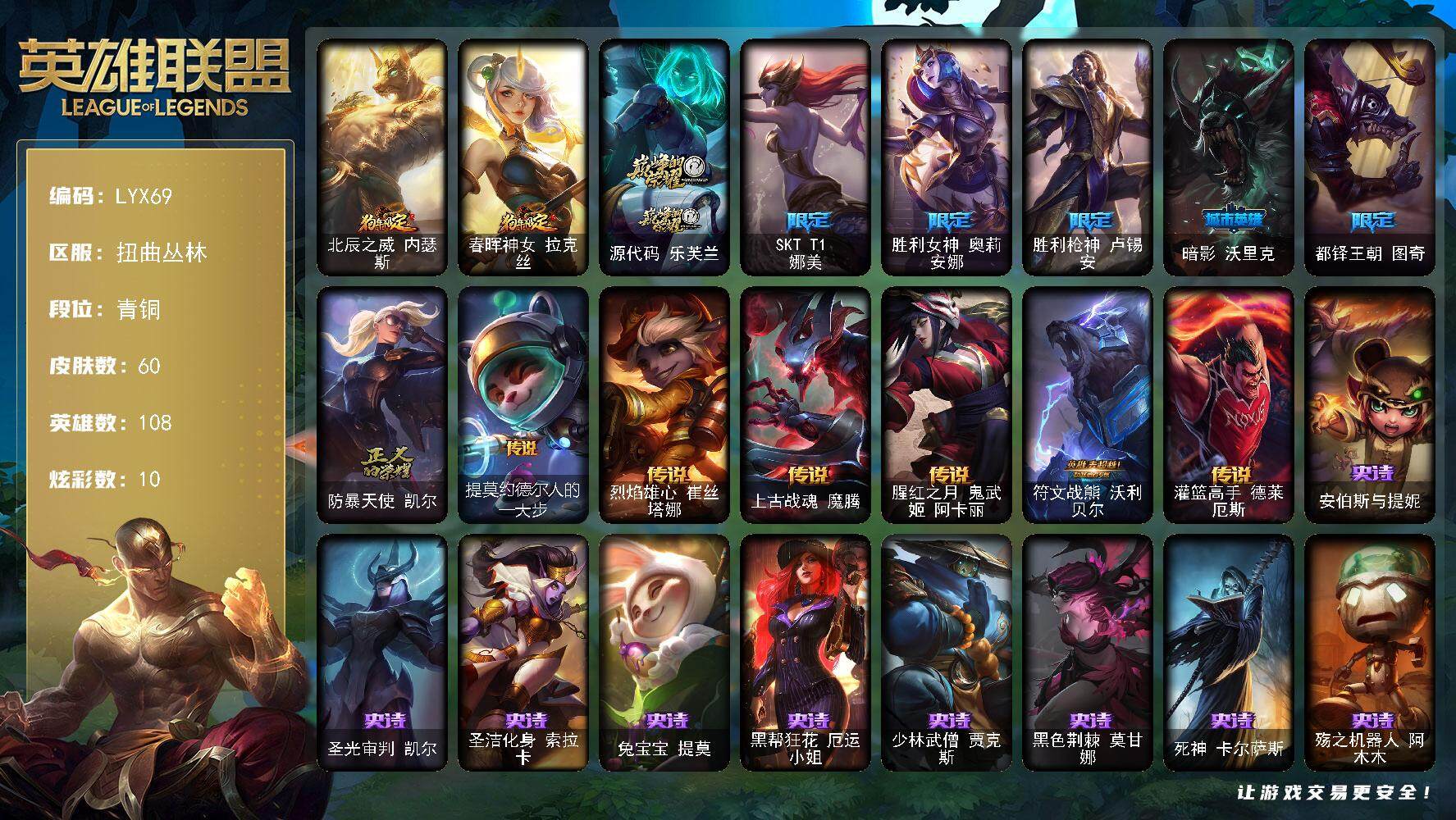 [14774832]可二次【店主推荐捡漏号!可直接换绑】 青铜段位-108英雄-60皮肤-10炫彩-0终极-1神话-8限定-6传说-19史诗